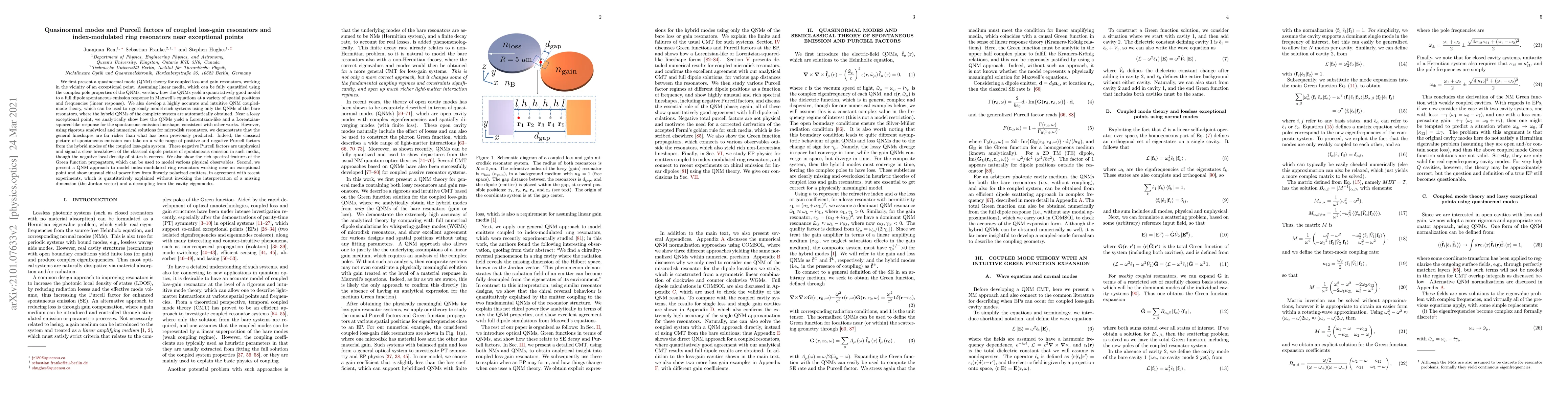 We first present a quasinormal mode (QNM) theory for coupled loss-gain resonators working near an exceptional point. Assuming linear media, which can be fully quantified using the complex pole properties of the QNMs, we show how the QNMs yield a quantitatively good model to a full dipole spontaneous emission response in Maxwell's equations at various spatial positions and frequencies (linear response). We also develop a highly accurate and intuitive QNM coupled-mode theory, which can be used to rigorously model such systems using only the QNMs of the bare resonators, where the hybrid QNMs of the complete system are automatically obtained. Near a lossy exceptional point, we analytically show how the QNMs yield a Lorentzian-like and a Lorentzian-squared-like response for the spontaneous emission lineshape, consistent with other works. However, using rigorous analytical and numerical solutions for microdisk resonators, we demonstrate that the general lineshapes are far richer than what has been previously predicted. Indeed, the classical picture of spontaneous emission can take on a wide range of positive and negative Purcell factors from the hybrid modes of the coupled loss-gain system. These negative Purcell factors are unphysical and signal a clear breakdown of the classical dipole picture of spontaneous emission in such media, though the negative local density of states is correct. We also show the rich spectral features of the Green function propagators, which can be used to model various physical observables. Second, we present a QNM approach to model index modulated ring resonators working near an exceptional point and show unusual chiral power flow from linearly polarized emitters, in agreement with recent experiments, which is quantitatively explained without invoking the interpretation of a missing dimension (the Jordan vector) and a decoupling from the cavity eigenmodes.