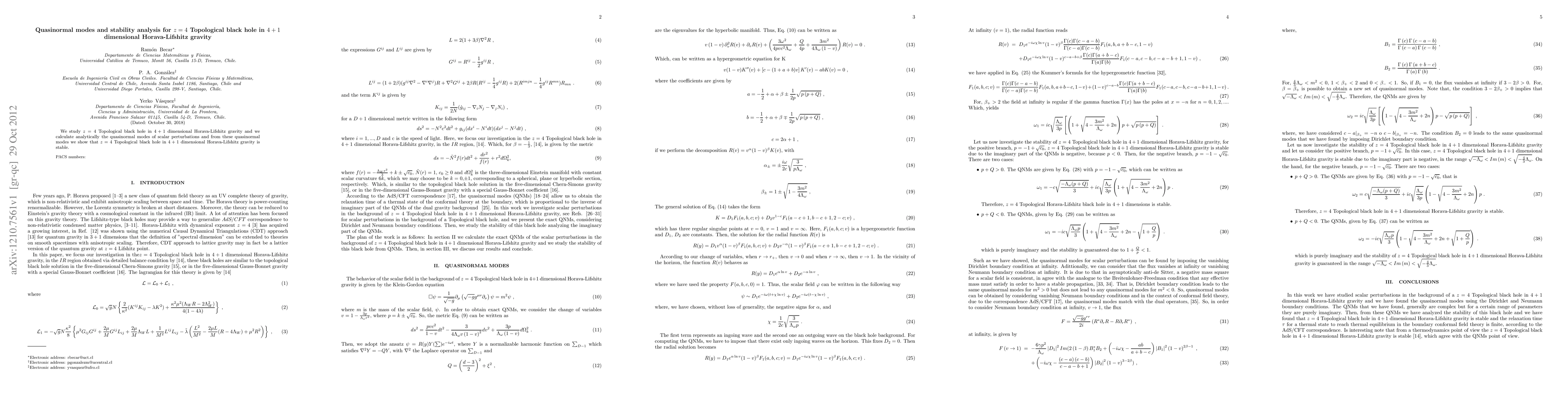 This paper investigates a z=4 Topological black hole in 4+1 dimensional Horava-Lifshitz gravity, analytically calculating its quasinormal modes for scalar perturbations and demonstrating the black hole's stability through these modes.