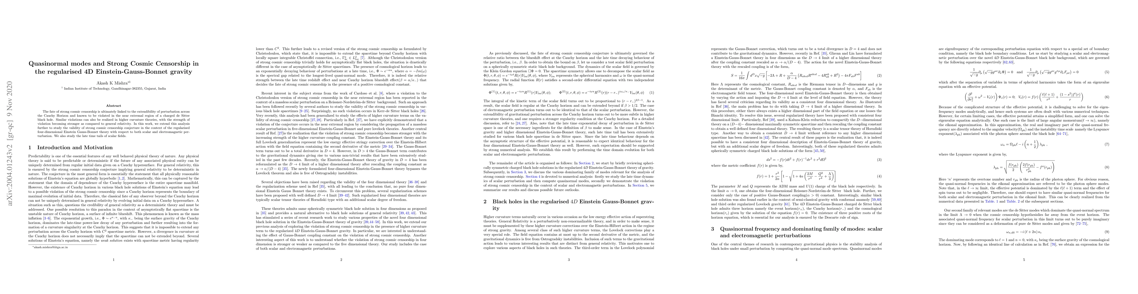This paper investigates the validity of the strong cosmic censorship conjecture in regularised four-dimensional Einstein-Gauss-Bonnet gravity, focusing on the extendibility of perturbations across the Cauchy Horizon in the context of scalar and electromagnetic perturbations. It also examines the late time behavior of scalar fields.