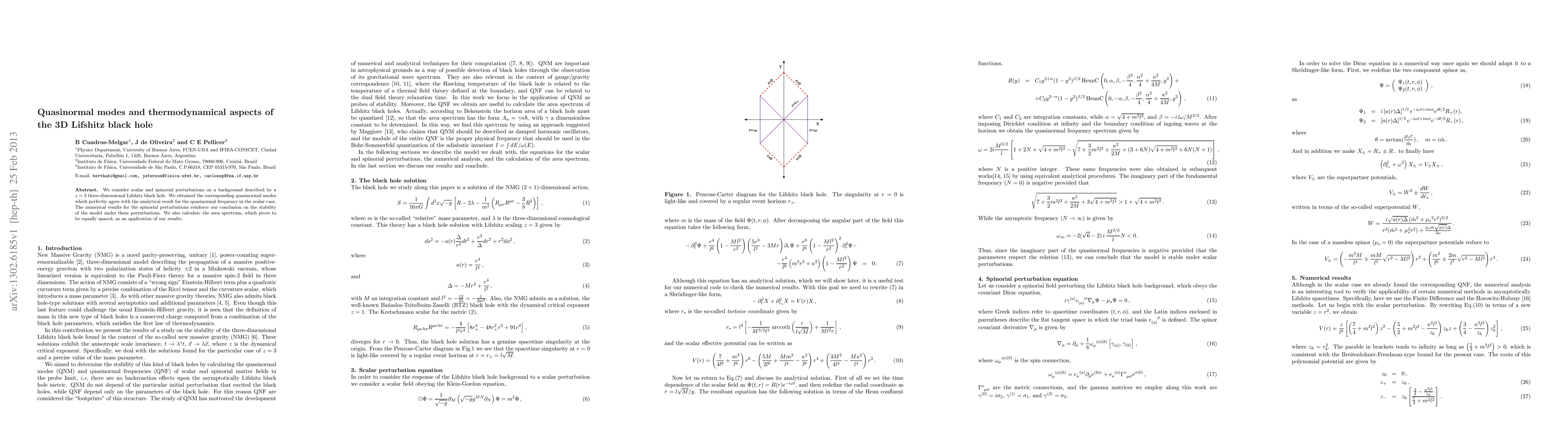 We consider scalar and spinorial perturbations on a background described by a $z=3$ three-dimensional Lifshitz black hole. We obtained the corresponding quasinormal modes which perfectly agree with the analytical result for the quasinormal frequency in the scalar case. The numerical results for the spinorial perturbations reinforce our conclusion on the stability of the model under these perturbations. We also calculate the area spectrum, which prove to be equally spaced, as an application of our results.