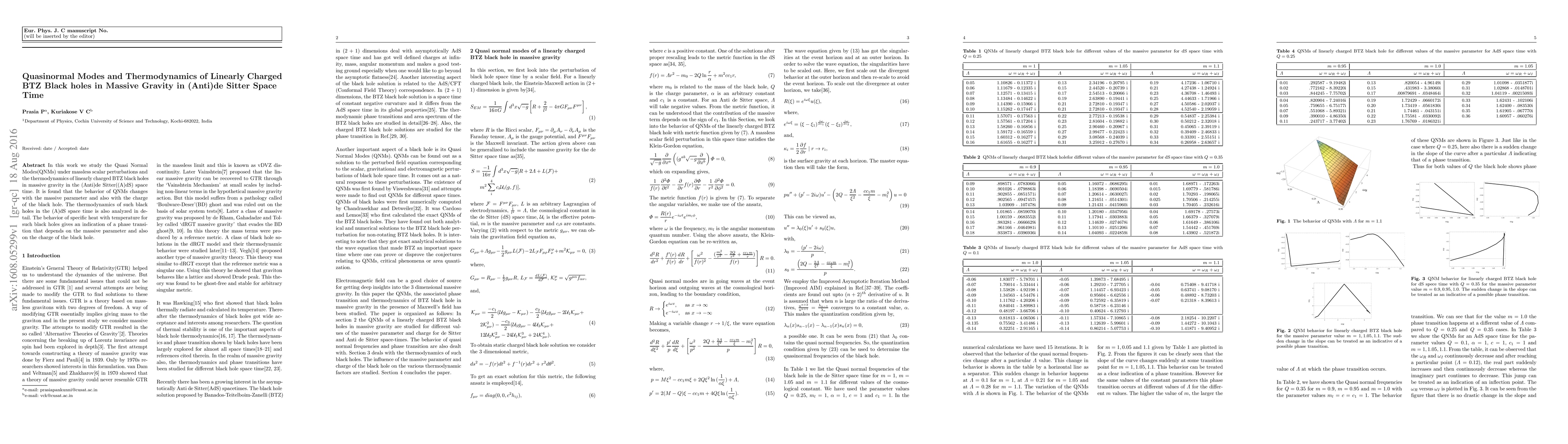 In this work we study the Quasi Normal Modes(QNMs) under massless scalar perturbations and the thermodynamics of linearly charged BTZ black holes in massive gravity in the (Anti)de Sitter((A)dS) space time. It is found that the behavior of QNMs changes with the massive parameter and also with the charge of the black hole. The thermodynamics of such black holes in the (A)dS space time is also analyzed in detail. The behavior of specific heat with temperature for such black holes gives an indication of a phase transition that depends on the massive parameter and also on the charge of the black hole.