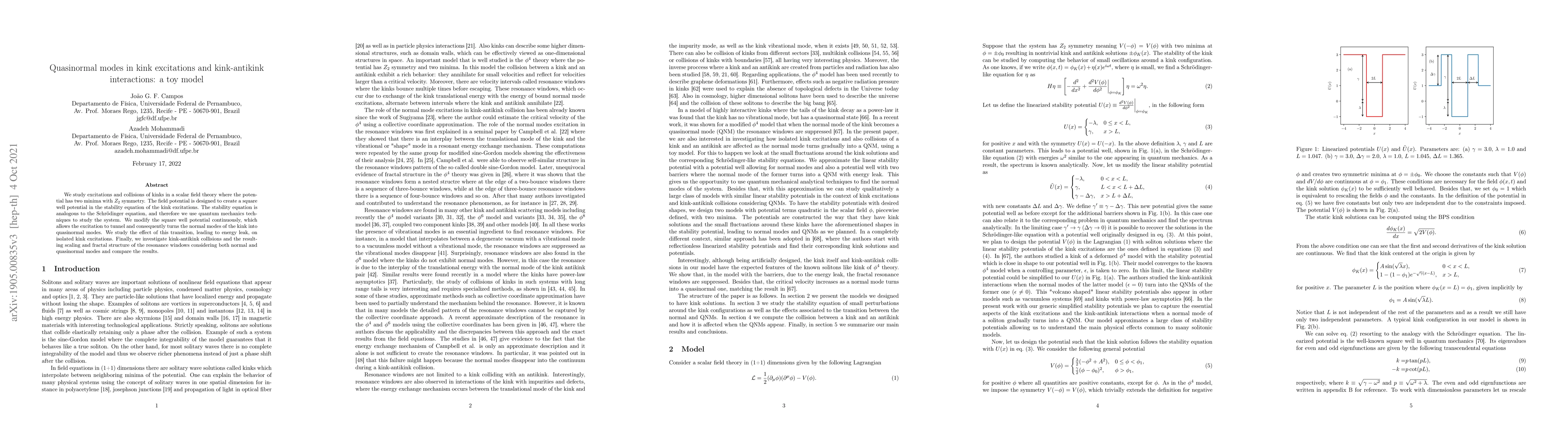 We study excitations and collisions of kinks in a scalar field theory where the potential has two minima with $Z_2$ symmetry. The field potential is designed to create a square well potential in the stability equation of the kink excitations. The stability equation is analogous to the Schr\"{o}dinger equation, and therefore we use quantum mechanics techniques to study the system. We modify the square well potential continuously, which allows the excitation to tunnel and consequently turns the normal modes of the kink into quasinormal modes. We study the effect of this transition, leading to energy leak, on isolated kink excitations. Finally, we investigate kink-antikink collisions and the resulting scaling and fractal structure of the resonance windows considering both normal and quasinormal modes and compare the results.