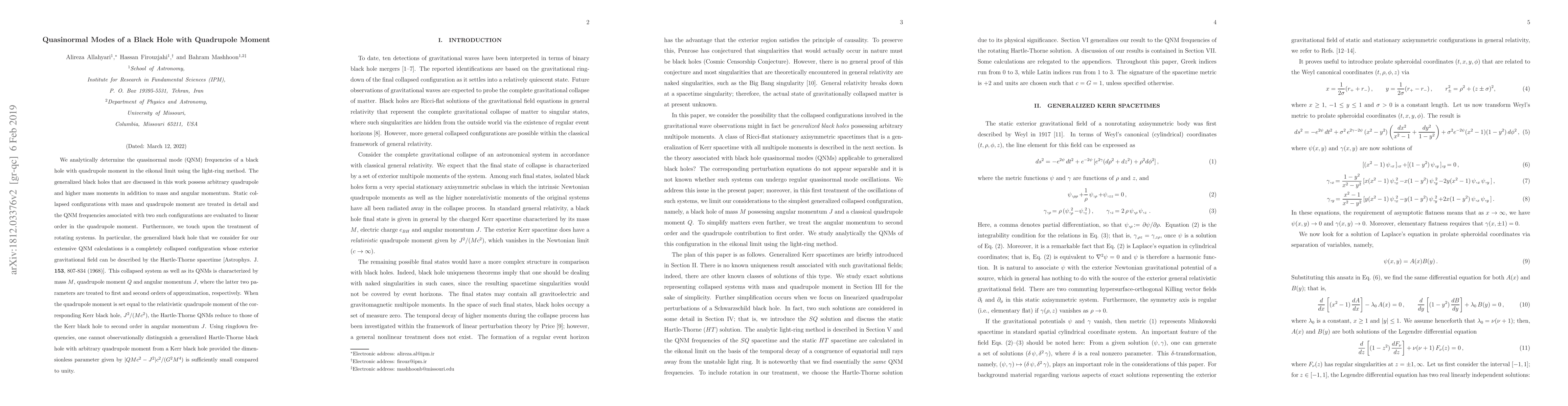 This paper analytically determines the quasinormal mode frequencies of a black hole with a quadrupole moment using the light-ring method, focusing on static collapsed configurations with mass and quadrupole moment. The study evaluates the QNMs to linear order in the quadrupole moment and discusses the Hartle-Thorne spacetime for rotating systems, showing that observationally, a generalized black hole with a small quadrupole moment cannot be distinguished from a Kerr black hole.