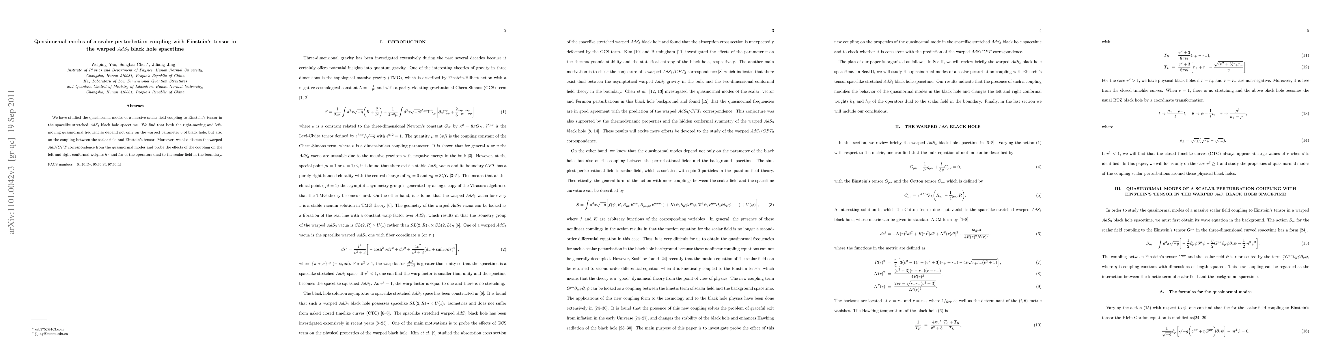 This research investigates the quasinormal modes of a massive scalar field in a warped $AdS_3$ black hole spacetime, revealing that frequencies depend on both the black hole's warp parameter and the scalar-Einstein tensor coupling. It also explores the implications for the $AdS/CFT$ correspondence and the impact on the conformal weights of boundary operators.