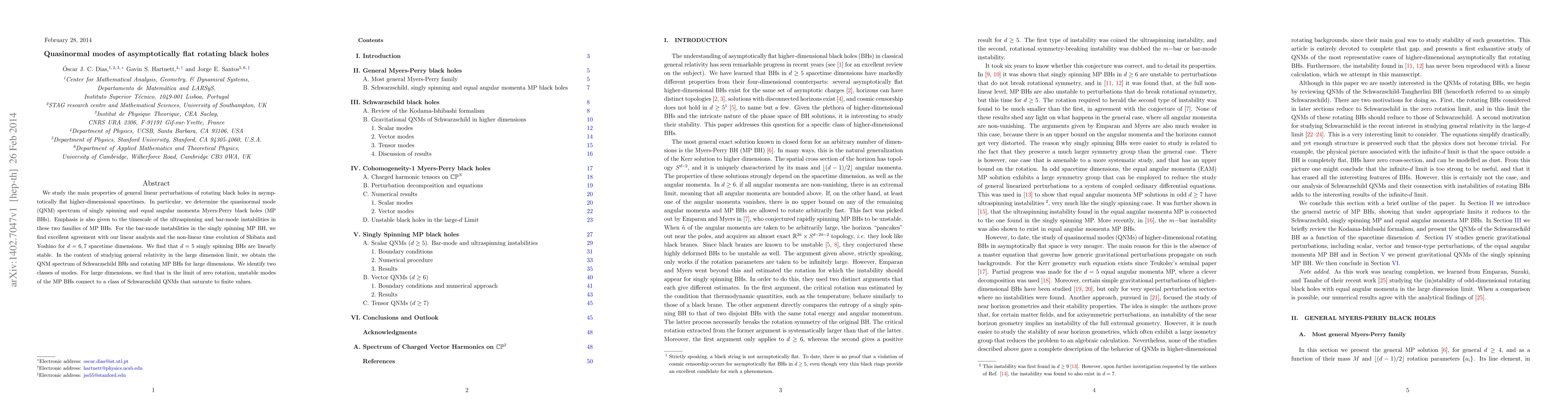 We study the main properties of general linear perturbations of rotating black holes in asymptotically flat higher-dimensional spacetimes. In particular, we determine the quasinormal mode (QNM) spectrum of singly spinning and equal angular momenta Myers-Perry black holes (MP BHs). Emphasis is also given to the timescale of the ultraspinning and bar-mode instabilities in these two families of MP BHs. For the bar-mode instabilities in the singly spinning MP BH, we find excellent agreement with our linear analysis and the non-linear time evolution of Shibata and Yoshino for d=6,7 spacetime dimensions. We find that d=5 singly spinning BHs are linearly stable. In the context of studying general relativity in the large dimension limit, we obtain the QNM spectrum of Schwarzschild BHs and rotating MP BHs for large dimensions. We identify two classes of modes. For large dimensions, we find that in the limit of zero rotation, unstable modes of the MP BHs connect to a class of Schwarzschild QNMs that saturate to finite values.