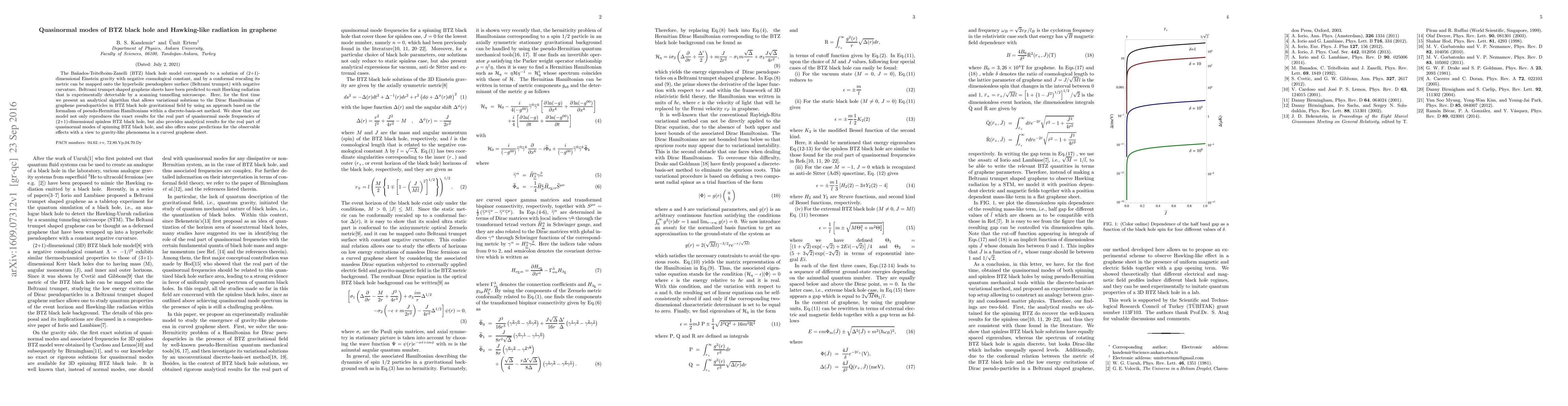 The Ba\~{n}ados-Teitelboim-Zanelli (BTZ) black hole model corresponds to a solution of (2+1)-dimensional Einstein gravity with negative cosmological constant, and by a conformal rescaling its metric can be mapped onto the hyperbolic pseudosphere surface (Beltrami trumpet) with negative curvature. Beltrami trumpet shaped graphene sheets have been predicted to emit Hawking radiation that is experimentally detectable by a scanning tunnelling microscope. Here, for the first time we present an analytical algorithm that allows variational solutions to the Dirac Hamiltonian of graphene pseudoparticles in BTZ black hole gravitational field by using an approach based on the formalism of pseudo-Hermitian Hamiltonians within a discrete-basis-set method. We show that our model not only reproduces the exact results for the real part of quasinormal mode frequencies of (2+1)-dimensional spinless BTZ black hole, but also provides analytical results for the real part of quasinormal modes of spinning BTZ black hole, and also offers some predictions for the observable effects with a view to gravity-like phenomena in a curved graphene sheet.