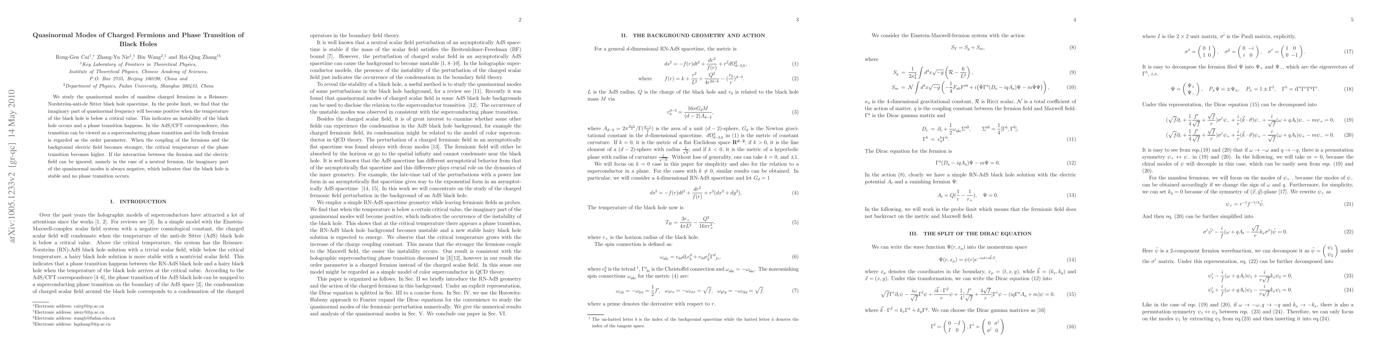 We study the quasinormal modes of massless charged fermions in a Reissner-Nordstrom-anti-de Sitter black hole spacetime. In the probe limit, we find that the imaginary part of quasinormal frequency will become positive when the temperature of the black hole is below a critical value. This indicates an instability of the black hole occurs and a phase transition happens. In the AdS/CFT correspondence, this transition can be viewed as a superconducting phase transition and the bulk fermion is regarded as the order parameter. When the coupling of the fermions and the background electric field becomes stronger, the critical temperature of the phase transition becomes higher. If the interaction between the fermion and the electric field can be ignored, namely in the case of a neutral fermion, the imaginary part of the quasinormal modes is always negative, which indicates that the black hole is stable and no phase transition occurs.