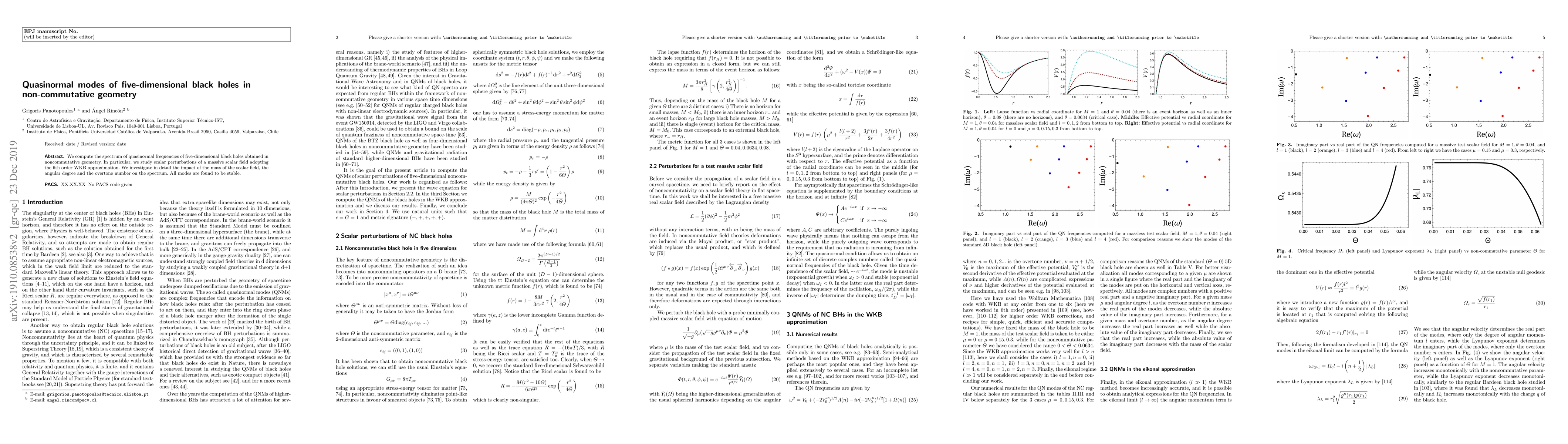 We compute the spectrum of quasinormal frequencies of five-dimensional black holes obtained in noncommutative geometry. In particular, we study scalar perturbations of a massive scalar field adopting the 6th order WKB approximation. We investigate in detail the impact of the mass of the scalar field, the angular degree and the overtone number on the spectrum. All modes are found to be stable.