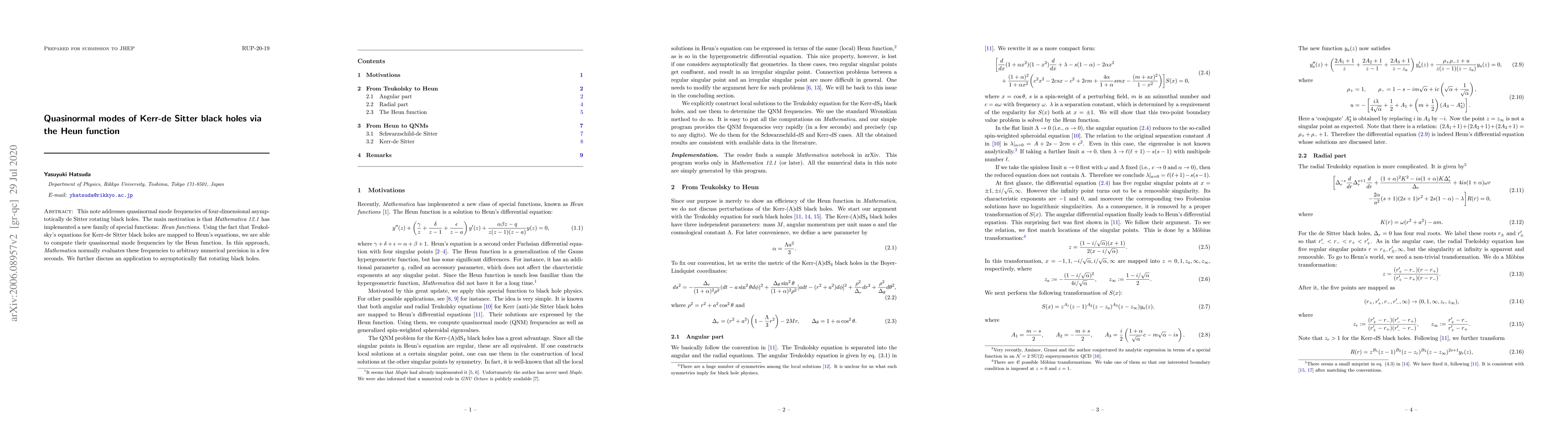 This paper computes quasinormal mode frequencies of four-dimensional Kerr-de Sitter black holes using Heun functions, leveraging Mathematica's new implementation of these functions. The method efficiently evaluates frequencies to arbitrary precision, and extends to asymptotically flat rotating black holes.