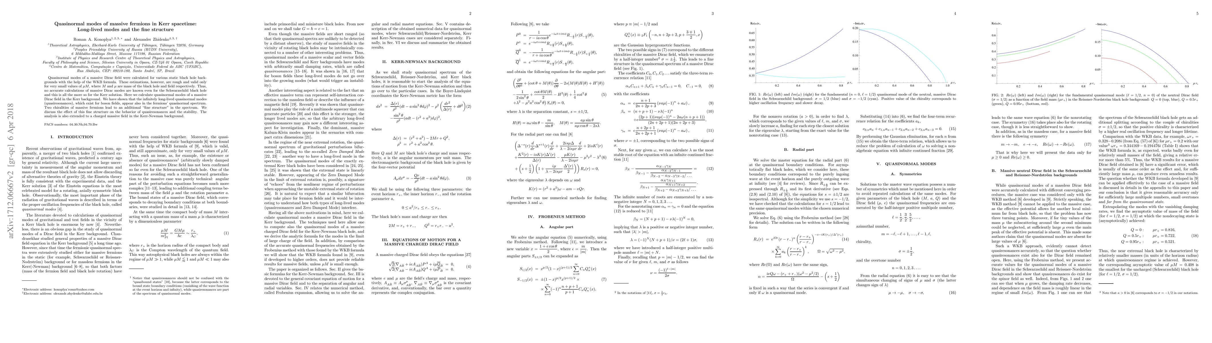 This paper calculates quasinormal modes for massive Dirac fields in Kerr spacetime, revealing long-lived quasiresonances and a "fine structure" due to two chiralities. The study extends the analysis to charged massive fields in Kerr-Newman spacetime, discussing the implications for stability.