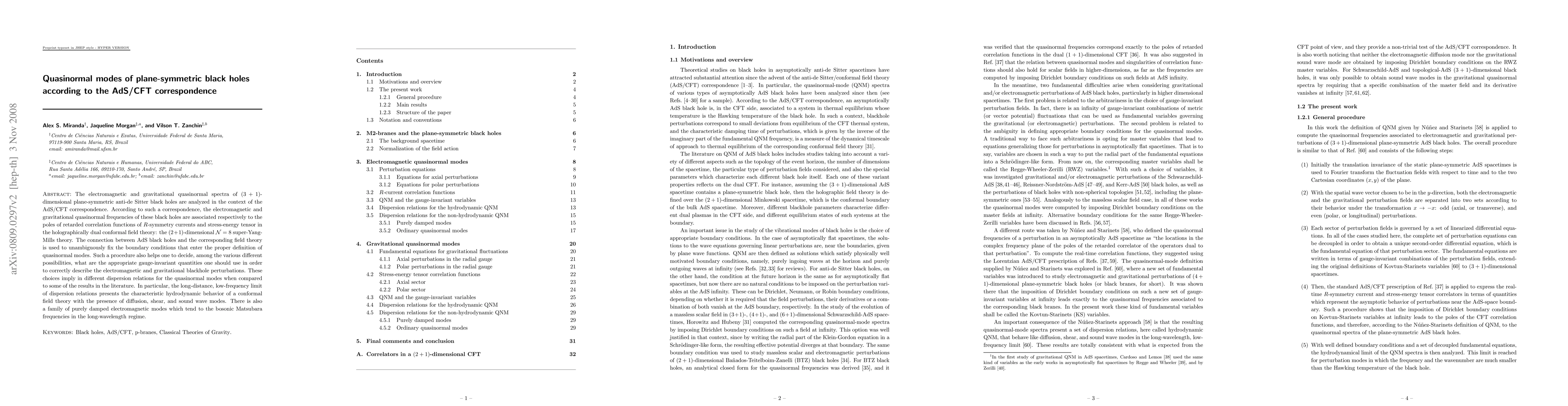 The electromagnetic and gravitational quasinormal spectra of $(3+1)$-dimensional plane-symmetric anti-de Sitter black holes are analyzed in the context of the AdS/CFT correspondence. According to such a correspondence, the electromagnetic and gravitational quasinormal frequencies of these black holes are associated respectively to the poles of retarded correlation functions of $R$-symmetry currents and stress-energy tensor in the holographically dual conformal field theory: the $(2+1)$-dimensional $\mathcal{N}=8$ super-Yang-Mills theory. The connection between AdS black holes and the corresponding field theory is used to unambiguously fix the boundary conditions that enter the proper definition of quasinormal modes. Such a procedure also helps one to decide, among the various different possibilities, what are the appropriate gauge-invariant quantities one should use in order to correctly describe the electromagnetic and gravitational blackhole perturbations. These choices imply in different dispersion relations for the quasinormal modes when compared to some of the results in the literature. In particular, the long-distance, low-frequency limit of dispersion relations presents the characteristic hydrodynamic behavior of a conformal field theory with the presence of diffusion, shear, and sound wave modes. There is also a family of purely damped electromagnetic modes which tend to the bosonic Matsubara frequencies in the long-wavelength regime.