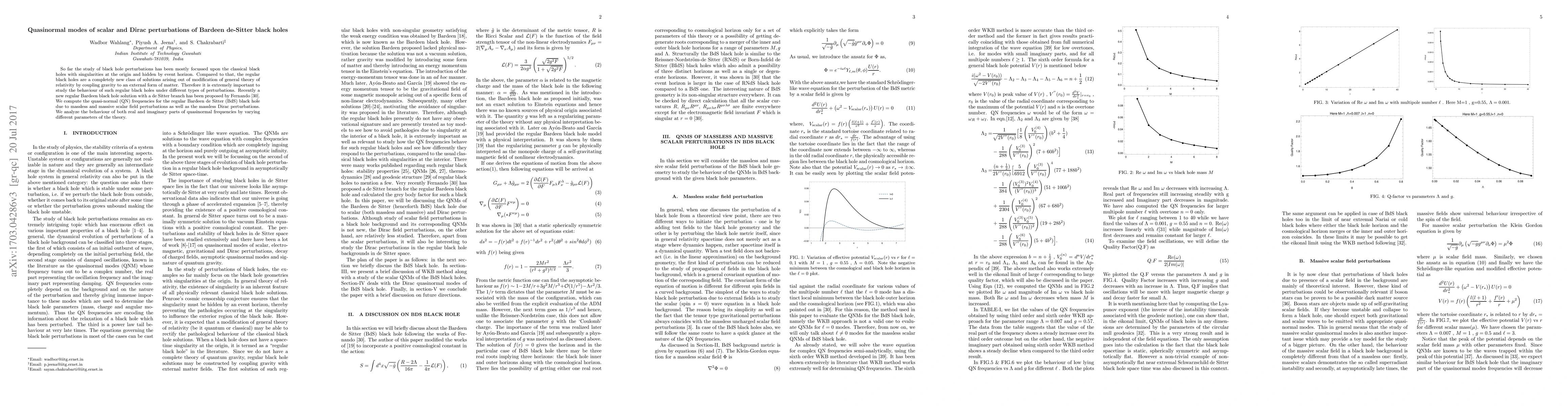 This paper investigates the quasinormal modes of perturbations in regular Bardeen de Sitter black holes, analyzing both massless and massive scalar field perturbations and massless Dirac field perturbations. It examines how different parameters affect the real and imaginary parts of the quasinormal frequencies.