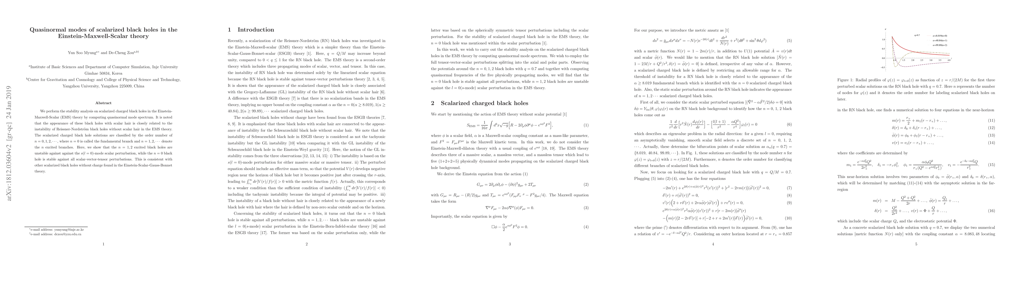 This study analyzes the stability of scalarized charged black holes in Einstein-Maxwell-Scalar theory, finding that $n=1,2$ excited black holes are unstable to $s$-mode perturbations, while the fundamental $n=0$ black hole remains stable against all perturbations.