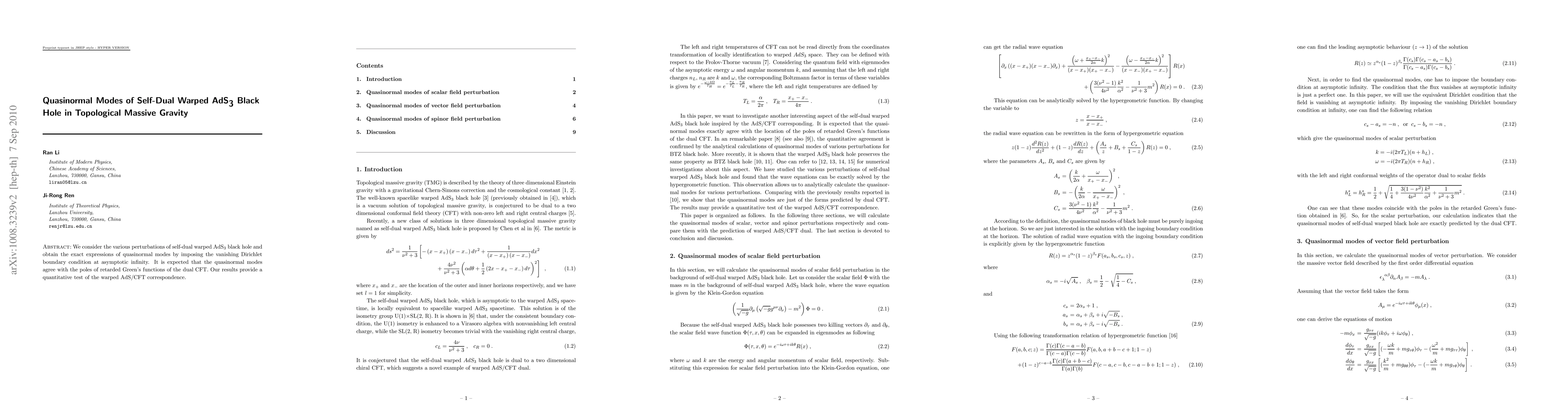 We consider the various perturbations of self-dual warped AdS$_3$ black hole and obtain the exact expressions of quasinormal modes by imposing the vanishing Dirichlet boundary condition at asymptotic infinity. It is expected that the quasinormal modes agree with the poles of retarded Green's functions of the dual CFT. Our results provide a quantitative test of the warped AdS/CFT correspondence.