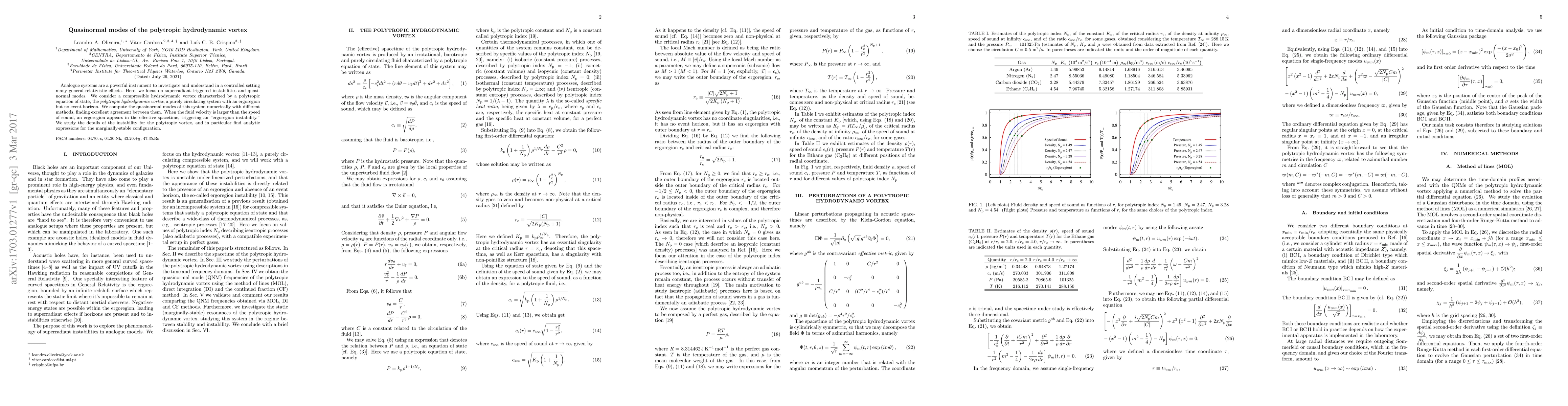 This paper investigates the quasinormal modes of a polytropic hydrodynamic vortex, using it as an analogue system to study general-relativistic effects. The authors compute these modes numerically and find an "ergoregion instability" when fluid velocity exceeds the speed of sound, deriving analytic expressions for the marginally-stable configuration.