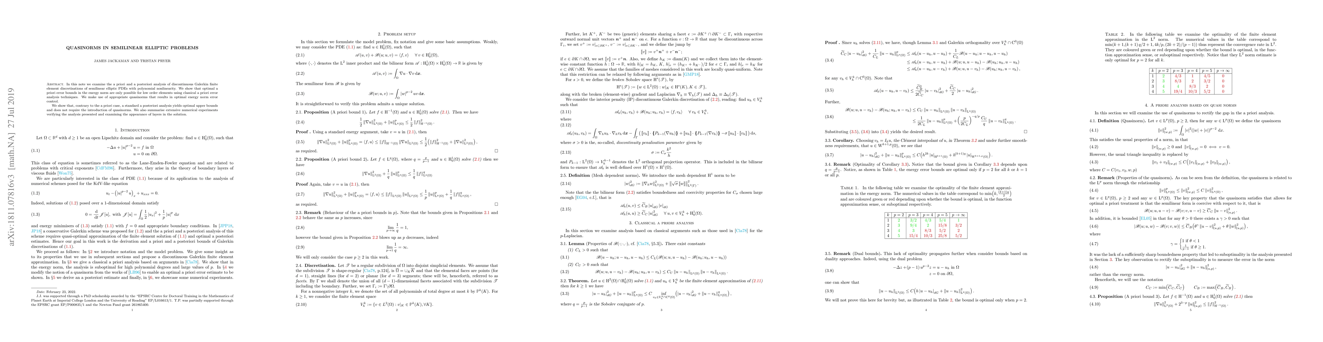 In this note we examine the a priori and a posteriori analysis of discontinuous Galerkin finite element discretisations of semilinear elliptic PDEs with polynomial nonlinearity. We show that optimal a priori error bounds in the energy norm are only possible for low order elements using classical a priori error analysis techniques. We make use of appropriate quasinorms that results in optimal energy norm error control. We show that, contrary to the a priori case, a standard a posteriori analysis yields optimal upper bounds and does not require the introduction of quasinorms. We also summarise extensive numerical experiments verifying the analysis presented and examining the appearance of layers in the solution.