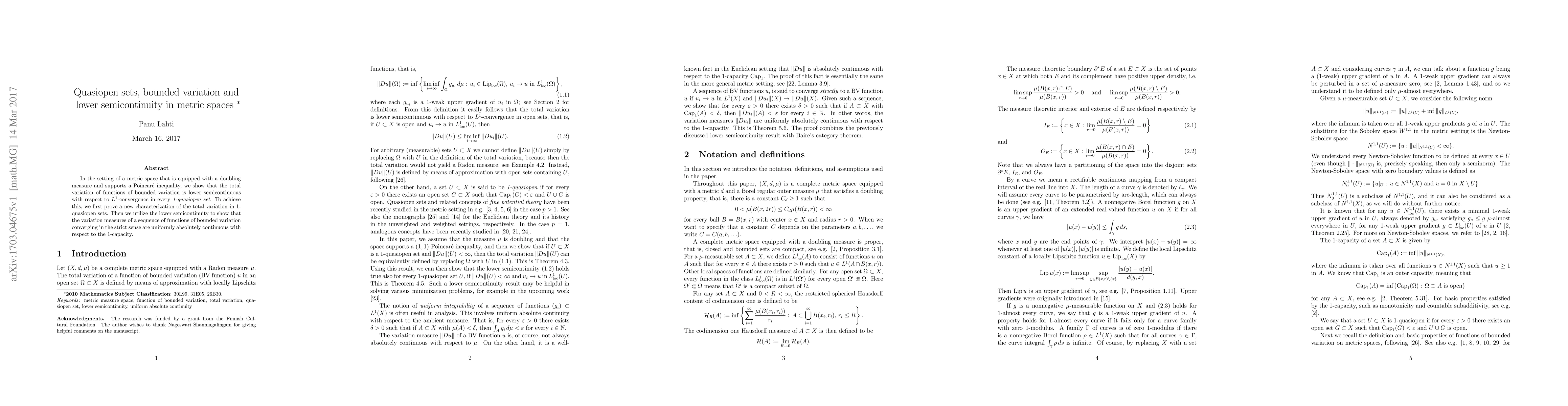 This paper demonstrates that in metric spaces with a doubling measure and Poincaré inequality, the total variation of functions of bounded variation is lower semicontinuous with respect to $L^1$-convergence within $1$-quasiopen sets. It achieves this through a new characterization of total variation in $1$-quasiopen sets and shows uniform absolute continuity of variation measures for converging function sequences.