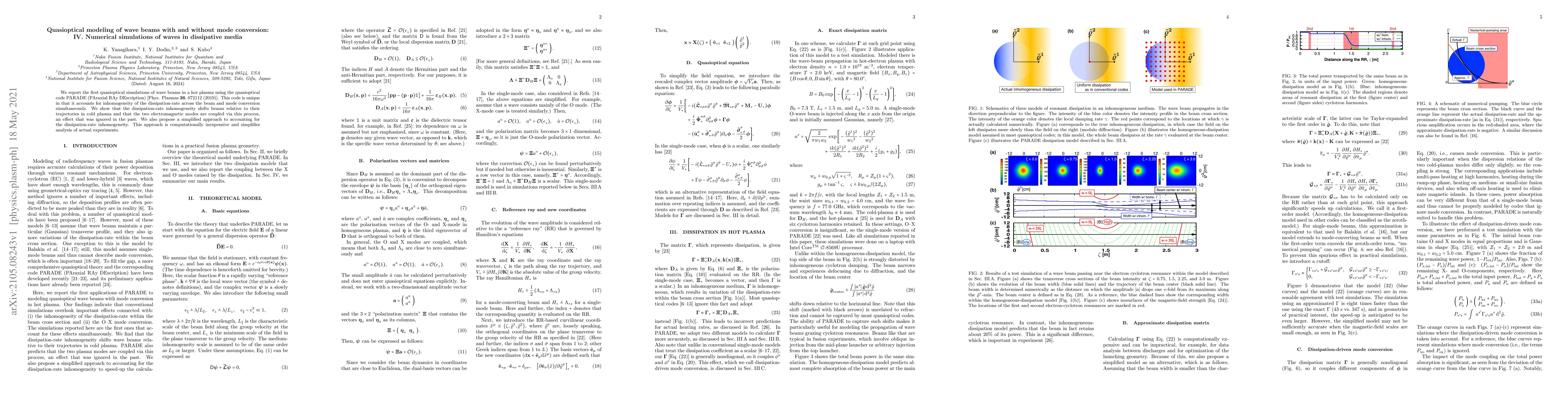 We report the first quasioptical simulations of wave beams in a hot plasma using the quasioptical code PARADE (PAraxial RAy DEscription) [Phys. Plasmas 26, 072112 (2019)]. This code is unique in that it accounts for inhomogeneity of the dissipation-rate across the beam and mode conversion simultaneously. We show that the dissipation-rate inhomogeneity shifts beams relative to their trajectories in cold plasma and that the two electromagnetic modes are coupled via this process, an effect that was ignored in the past. We also propose a simplified approach to accounting for the dissipation-rate inhomogeneity. This approach is computationally inexpensive and simplifies analysis of actual experiments.