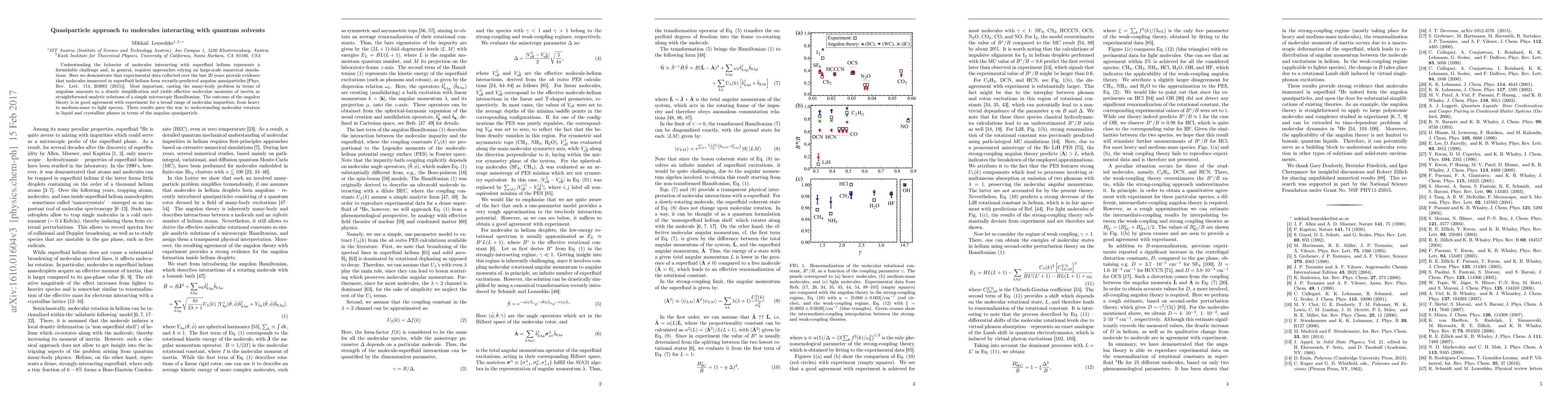 Understanding the behavior of molecules interacting with superfluid helium represents a formidable challenge and, in general, requires approaches relying on large-scale numerical simulations. Here we demonstrate that experimental data collected over the last 20 years provide evidence that molecules immersed in superfluid helium form recently-predicted angulon quasiparticles [Phys. Rev. Lett. 114, 203001 (2015)]. Most importantly, casting the many-body problem in terms of angulons amounts to a drastic simplification and yields effective molecular moments of inertia as straightforward analytic solutions of a simple microscopic Hamiltonian. The outcome of the angulon theory is in good agreement with experiment for a broad range of molecular impurities, from heavy to medium-mass to light species. These results pave the way to understanding molecular rotation in liquid and crystalline phases in terms of the angulon quasiparticle.