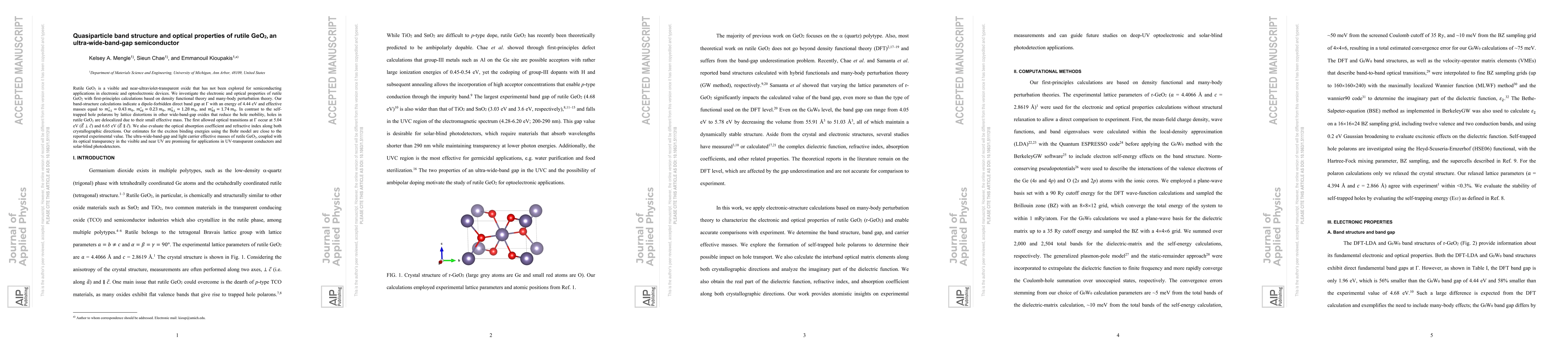 Rutile GeO$_2$ is a visible and near-ultraviolet-transparent oxide that has not been explored for semiconducting applications in electronic and optoelectronic devices. We investigate the electronic and optical properties of rutile GeO$_2$ with first-principles calculations based on density functional theory and many-body perturbation theory. Our band-structure calculations indicate a dipole-forbidden direct band gap at $\Gamma$ with an energy of 4.44 eV and effective masses equal to $m^*_{e\perp}$ =0.43$m_0$ , $m^*_{e||}$ =0.23$m_0$ , $m^*_{h\perp}$ =1.28$m_0$ , and $m^*_{h||}$=1.74$m_0$ . In contrast to the self-trapped hole polarons by lattice distortions in other wide-band-gap oxides that reduce the hole mobility, holes in rutile GeO$_2$ are delocalized due to their small effective mass. The first allowed optical transitions at $\Gamma$ occur at 5.04 eV ($\vec{E} \perp \vec{c}$) and 6.65 eV ($\vec{E} ||\vec{c} $). We also evaluate the optical absorption coefficient and refractive index along both crystallographic directions. Our estimates for the exciton binding energies using the Bohr model are close to the reported experimental value. The ultra-wide-band-gap and light carrier effective masses of rutile GeO$_2$, coupled with its optical transparency in the visible and near UV are promising for applications in UV-transparent conductors and solar-blind photodetectors.