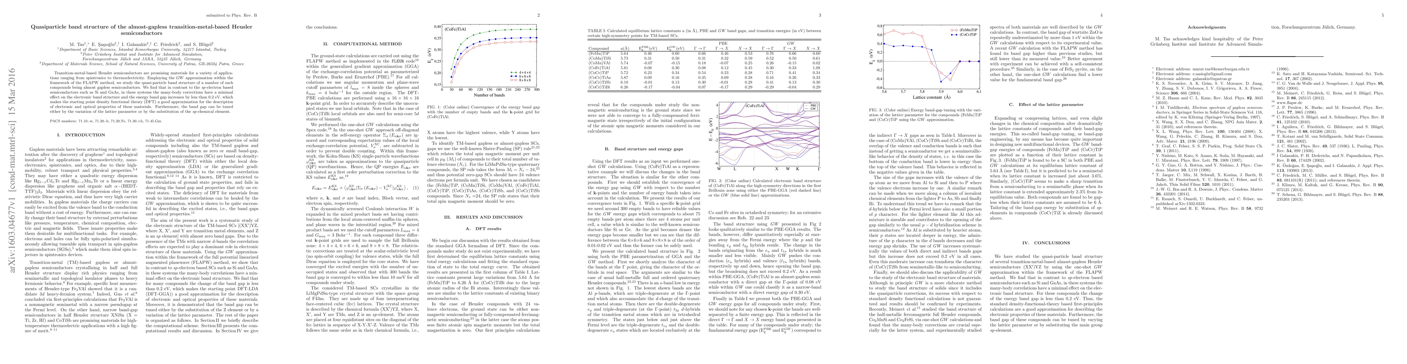 Transition-metal-based Heusler semiconductors are promising materials for a variety of applications ranging from spintronics to thermoelectricity. Employing the $GW$ approximation within the framework of the FLAPW method, we study the quasi-particle band structure of a number of such compounds being almost gapless semiconductors. We find that in contrast to the \textit{sp}-electron based semiconductors such as Si and GaAs, in these systems the many-body corrections have a minimal effect on the electronic band structure and the energy band gap increases by less than 0.2~eV, which makes the starting point density functional theory (DFT) a good approximation for the description of electronic and optical properties of these materials. Furthermore, the band gap can be tuned either by the variation of the lattice parameter or by the substitution of the \emph{sp}-chemical element.