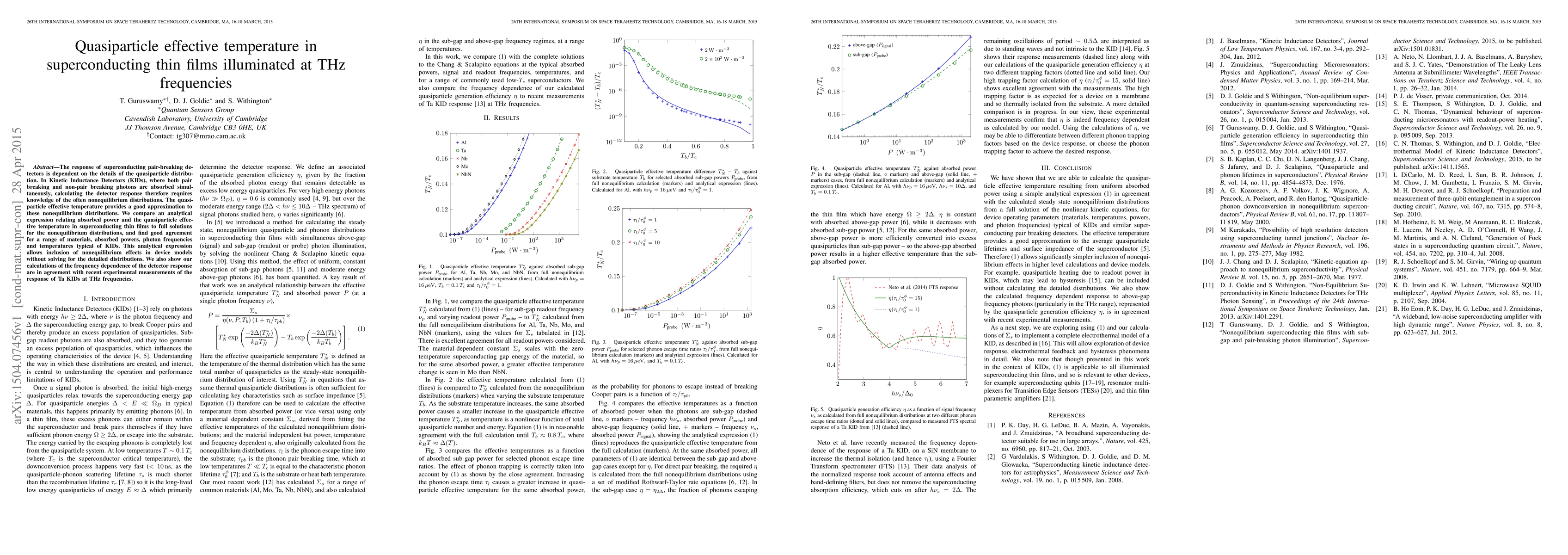 The response of superconducting pair-breaking detectors is dependent on the details of the quasiparticle distribution. In Kinetic Inductance Detectors (KIDs), where both pair breaking and non-pair breaking photons are absorbed simultaneously, calculating the detector response therefore requires knowledge of the often nonequilibrium distributions. The quasiparticle effective temperature provides a good approximation to these nonequilibrium distributions. We compare an analytical expression relating absorbed power and the quasiparticle effective temperature in superconducting thin films to full solutions for the nonequilibrium distributions, and find good agreement for a range of materials, absorbed powers, photon frequencies and temperatures typical of KIDs. This analytical expression allows inclusion of nonequilibrium effects in device models without solving for the detailed distributions. We also show our calculations of the frequency dependence of the detector response are in agreement with recent experimental measurements of the response of Ta KIDs at THz frequencies.