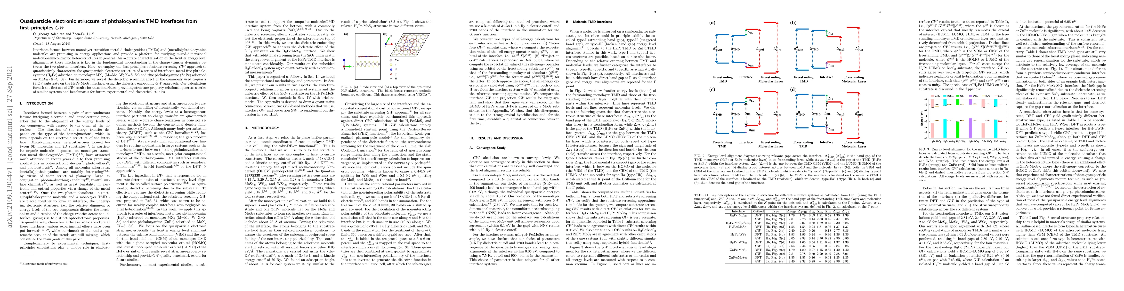This paper uses first-principles $GW$ calculations to determine the quasiparticle electronic structure of phthalocyanine:TMD interfaces, revealing the dielectric screening effect of $\alpha$-quartz on H$_2$Pc:MoS$_2$ and providing insights into charge transfer dynamics for energy applications. The results offer benchmarks for future studies and elucidate structure-property relationships.