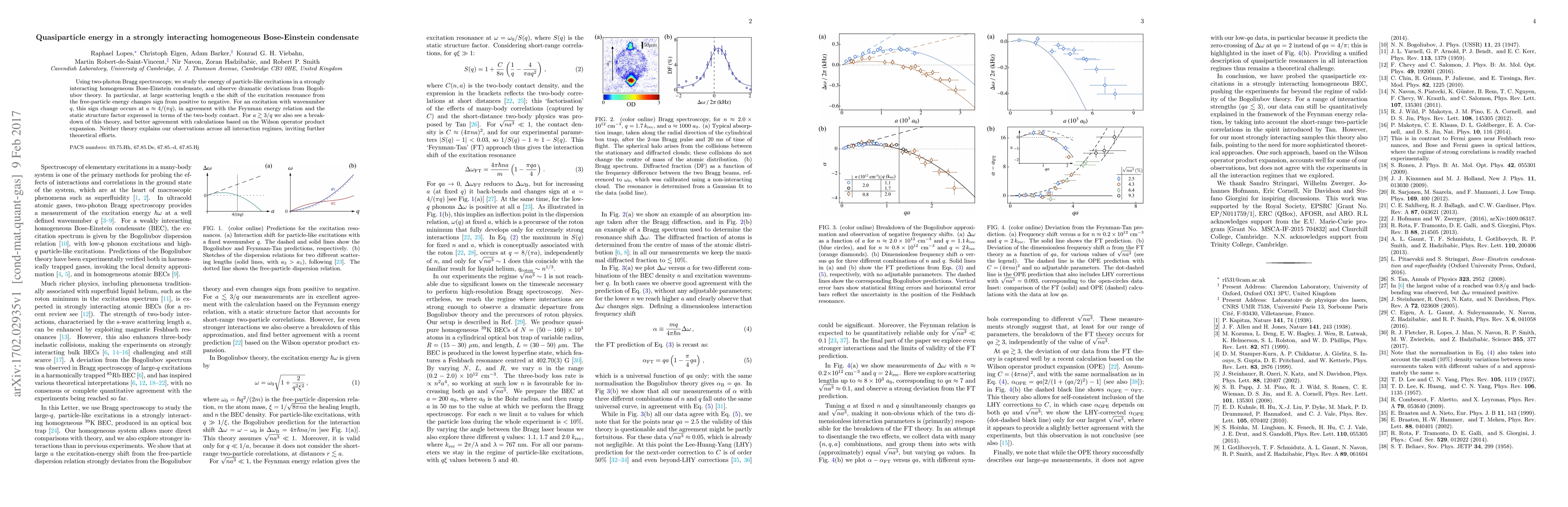 This study uses two-photon Bragg spectroscopy to investigate quasiparticle energy in a strongly interacting homogeneous Bose-Einstein condensate, revealing significant deviations from Bogoliubov theory, including a sign change in the excitation resonance shift at large scattering lengths. These findings suggest a need for new theoretical models to fully explain the observed phenomena.
