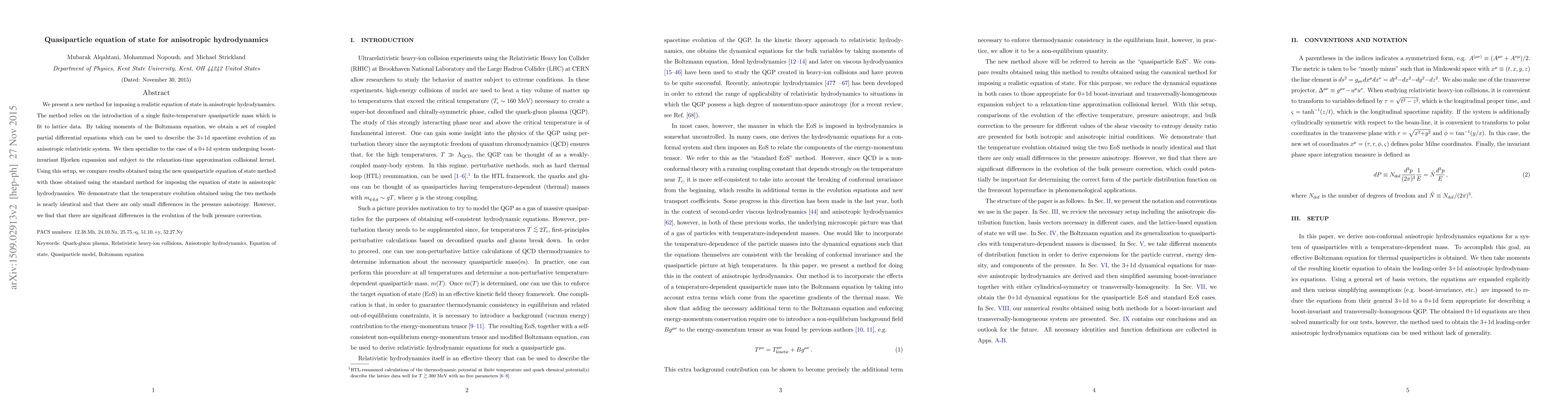 This paper introduces a quasiparticle equation of state method for anisotropic hydrodynamics, fitting a single quasiparticle mass to lattice data. The method shows nearly identical temperature evolution compared to the standard method but reveals significant differences in the bulk pressure correction.