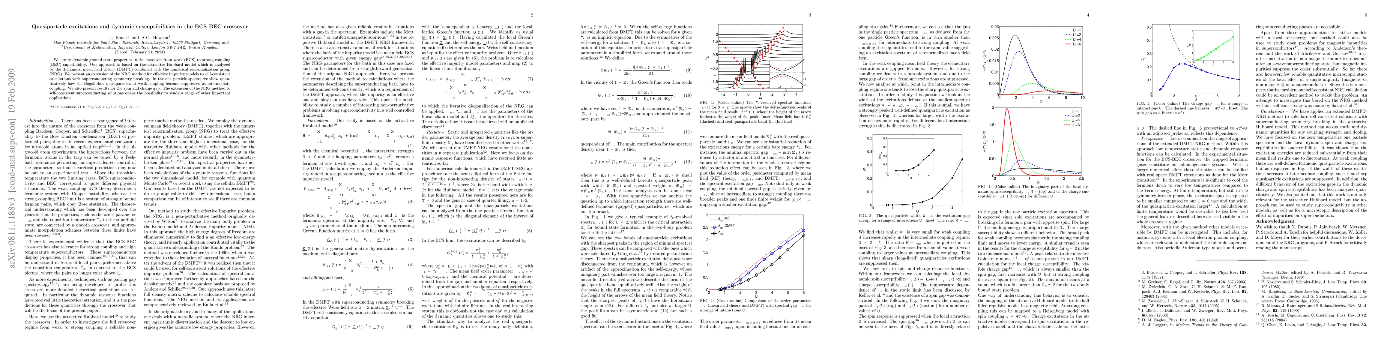 We study dynamic ground state properties in the crossover from weak (BCS) to strong coupling (BEC) superfluidity. Our approach is based on the attractive Hubbard model which is analyzed by the dynamical mean field theory (DMFT) combined with the numerical renormalization group (NRG). We present an extension of the NRG method for effective impurity models to selfconsistent calculations with superconducting symmetry breaking. In the one particle spectra we show quantitatively how the Bogoliubov quasiparticles at weak coupling become suppressed at intermediate coupling. We also present results for the spin and charge gap. The extension of the NRG method to selfconsistent superconducting solutions opens the possibility to study a range of other important applications.