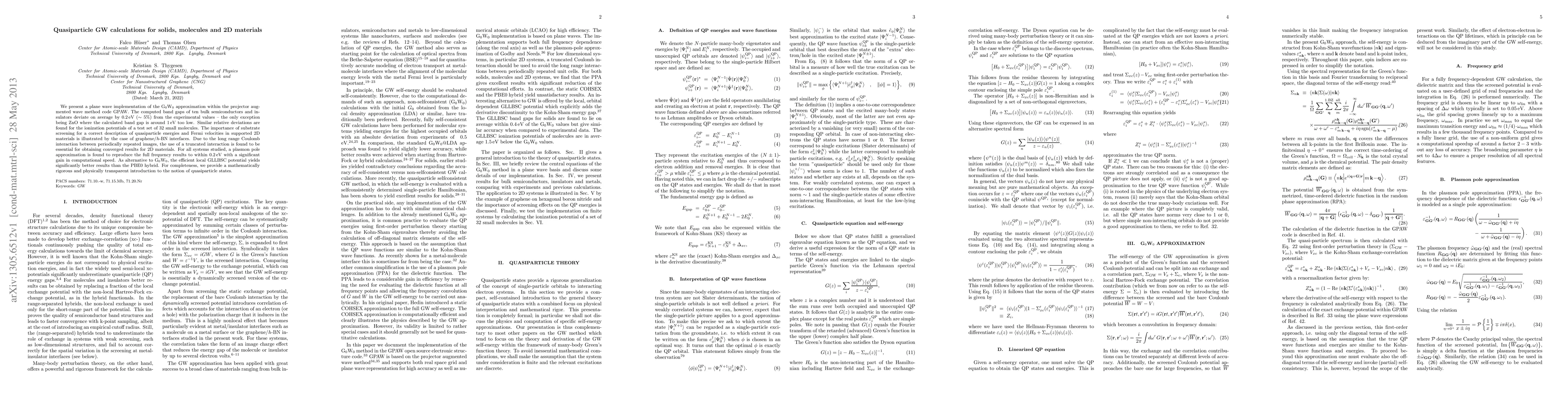 This study presents a plane wave implementation of the G0W0 approximation for solids, molecules, and 2D materials, with average band gap deviations of 5% from experimental values.