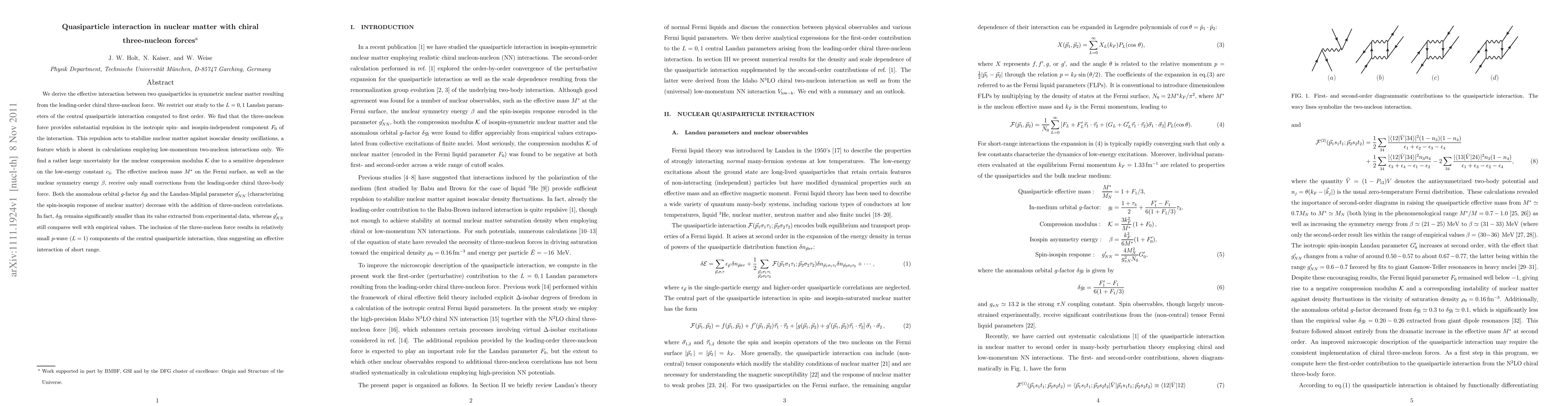 This paper investigates the effective interaction between quasiparticles in nuclear matter due to leading-order chiral three-nucleon forces, finding substantial repulsion that stabilizes nuclear matter against isoscalar density oscillations. The three-nucleon force leads to small corrections in the effective nucleon mass and nuclear symmetry energy but significantly reduces the anomalous orbital g-factor and Landau-Migdal parameter g'_{NN}.