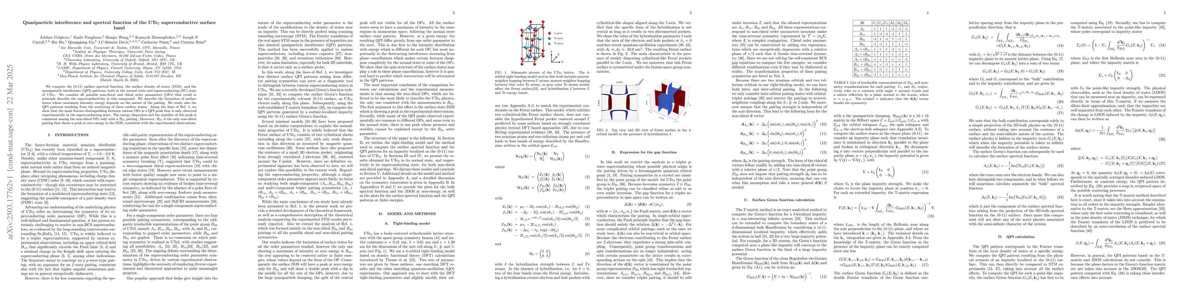 The paper presents a comprehensive analysis of surface spectral functions, surface DOS, and QPI patterns for UTe2, considering various non-chiral and chiral OPs, and identifies key distinguishing features in the superconducting state.