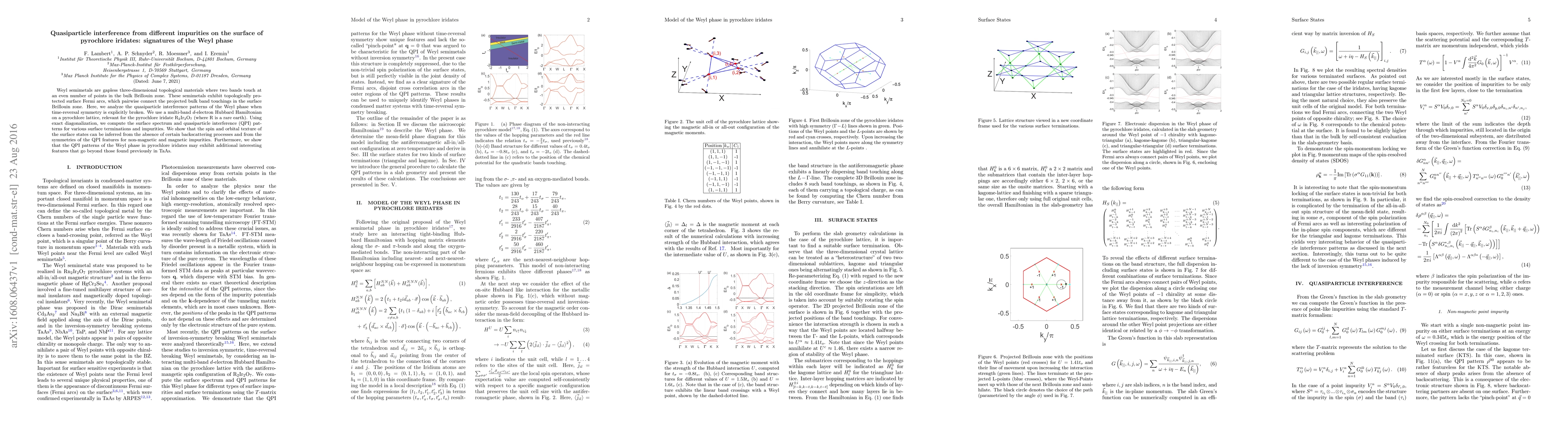Weyl semimetals are gapless three-dimensional topological materials where two bands touch at an even number of points in the bulk Brillouin zone. These semimetals exhibit topologically protected surface Fermi arcs, which pairwise connect the projected bulk band touchings in the surface Brillouin zone. Here, we analyze the quasiparticle interference patterns of the Weyl phase when time-reversal symmetry is explicitly broken. We use a multi-band $d$-electron Hubbard Hamiltonian on a pyrochlore lattice, relevant for the pyrochlore iridate R$_2$Ir$_2$O$_7$ (where R is a rare earth). Using exact diagonalization, we compute the surface spectrum and quasiparticle interference (QPI) patterns for various surface terminations and impurities. We show that the spin and orbital texture of the surface states can be inferred from the absence of certain backscattering processes and from the symmetries of the QPI features for non-magnetic and magnetic impurities. Furthermore, we show that the QPI patterns of the Weyl phase in pyrochlore iridates may exhibit additional interesting features that go beyond those found previously in TaAs.