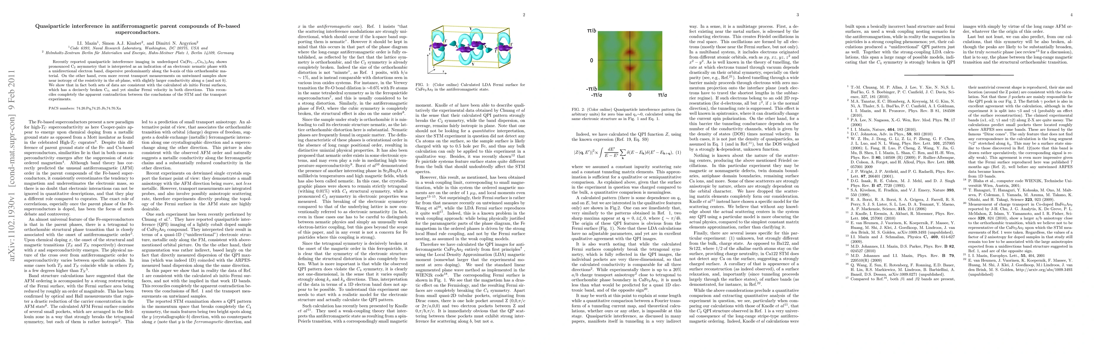 Recently reported quasiparticle interference imaging in underdoped Ca(Fe{1-x}Co{x})_2As{2} shows pronounced C{2} asymmetry that is interpreted as an indication of an electronic nematic phase with a unidirectional electron band, dispersive predominantly along the $b$-axis of this orthorhombic material. On the other hand, even more recent transport measurements on untwinned samples show near isotropy of the resistivity in the $ab$ plane, with slightly larger conductivity along a (and not b). We show that in fact both sets of data are consistent with the calculated ab initio Fermi surfaces, which has a decisively broken C_{4}, and yet similar Fermi velocity in both directions. This reconciles completely the apparent contradiction between the conclusions of the STM and the transport experiments.