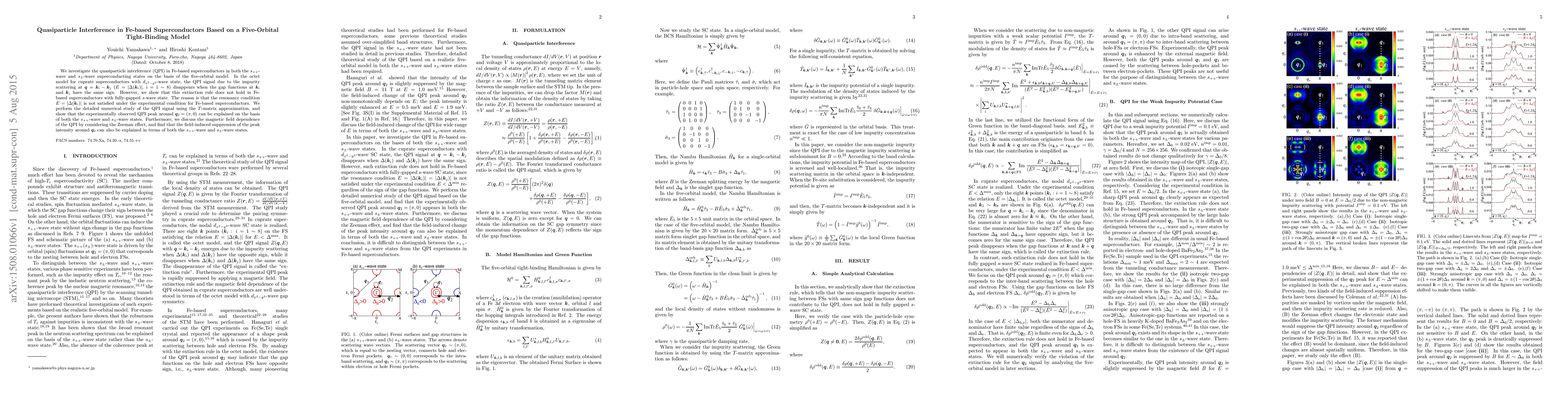 We investigate the quasiparticle interference (QPI) in Fe-based superconductors in both the $s_{++}$-wave and $s_{\pm}$-wave superconducting states on the basis of the five-orbital model. In the octet model for cuprate superconductors with $d_{x^2 - y^2}$-wave state, the QPI signal due to the impurity scattering at ${q} = {k}_i - {k}_j$ ($E = | \Delta ( {k}_i ) |$, $i = 1 \sim 8$) disappears when the gap functions at ${k}_i$ and ${k}_j$ have the same sign. However, we show that this extinction rule does not hold in Fe-based superconductors with fully-gapped $s$-wave state. The reason is that the resonance condition $E = | \Delta ( {k}_i ) |$ is not satisfied under the experimental condition for Fe-based superconductors. We perform the detailed numerical study of the QPI signal using the $T$-matrix approximation, and show that the experimentally observed QPI peak around ${q}_2 = ( \pi, 0 )$ can be explained on the basis of both the $s_{++}$-wave and $s_{\pm}$-wave states. Furthermore, we discuss the magnetic field dependence of the QPI by considering the Zeeman effect, and find that the field-induced suppression of the peak intensity around ${q}_2$ can also be explained in terms of both the $s_{++}$-wave and $s_{\pm}$-wave states.