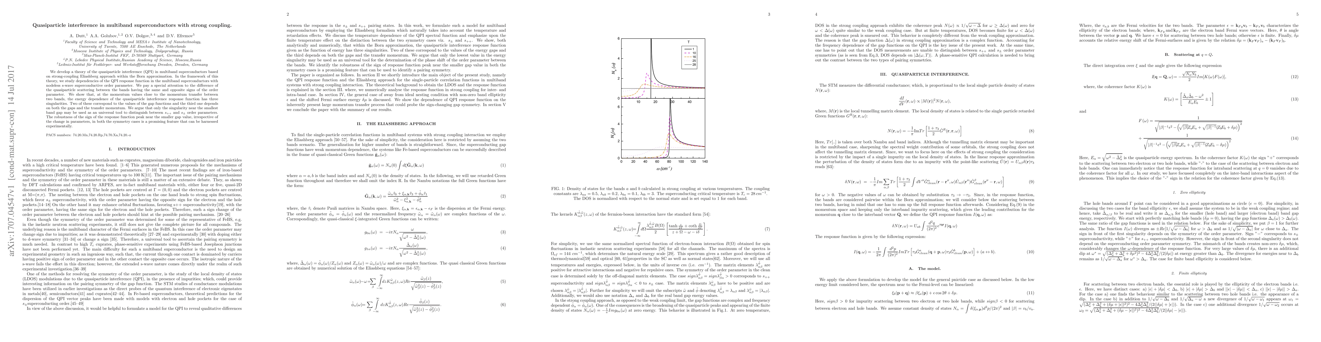 This paper develops a strong-coupling theory for quasiparticle interference in multiband superconductors, revealing three singularities in the energy dependence of the response function. It highlights the robustness of the response function peak near the smallest band gap, which can distinguish between different types of superconducting order parameters.