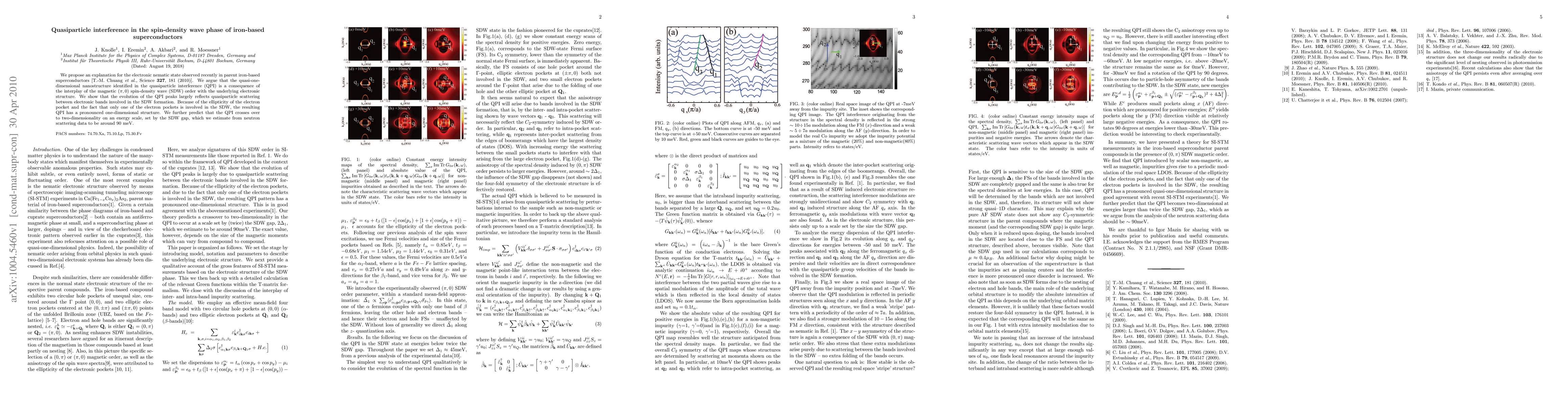 This paper explores quasiparticle interference (QPI) in iron-based superconductors, linking the observed electronic nematic state to the interplay between the magnetic spin-density wave and electronic structure, resulting in a quasi-one-dimensional QPI pattern due to the involvement of only one electron pocket in the spin-density wave formation. The study predicts a transition to two-dimensional QPI at an energy scale determined by the SDW gap.