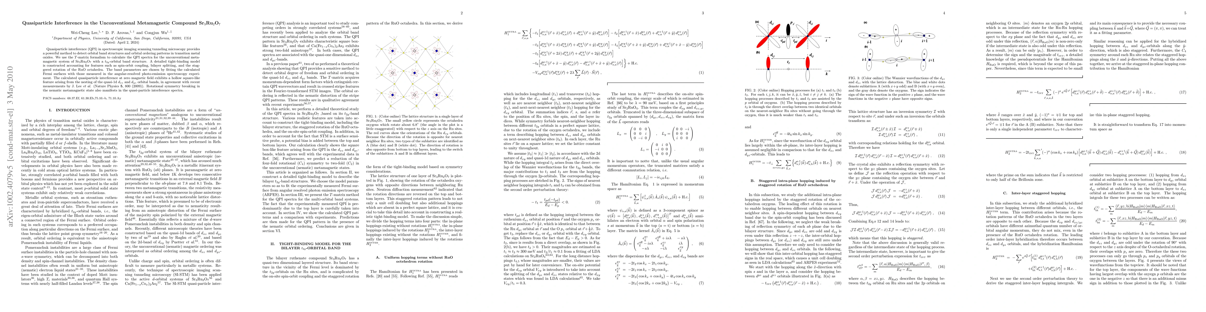 This paper investigates quasiparticle interference (QPI) in Sr$_3$Ru$_2$O$_7$ using spectroscopic imaging scanning tunneling microscopy, revealing a hollow square-like feature from the nesting of $d_{xz}$ and $d_{yz}$ orbital bands, consistent with experimental findings. The study also highlights rotational symmetry breaking in the nematic metamagnetic state.