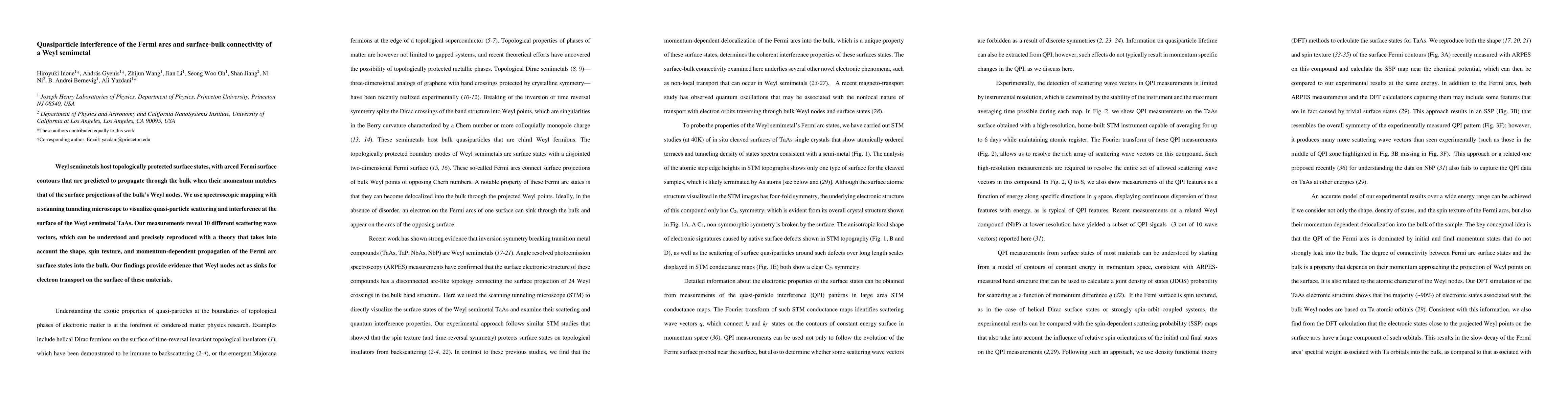 This study uses scanning tunneling microscopy to visualize quasiparticle interference in Weyl semimetal TaAs, revealing 10 distinct scattering wave vectors. The findings support the theory that Weyl nodes facilitate the propagation of Fermi arc surface states into the bulk, acting as electron transport sinks.
