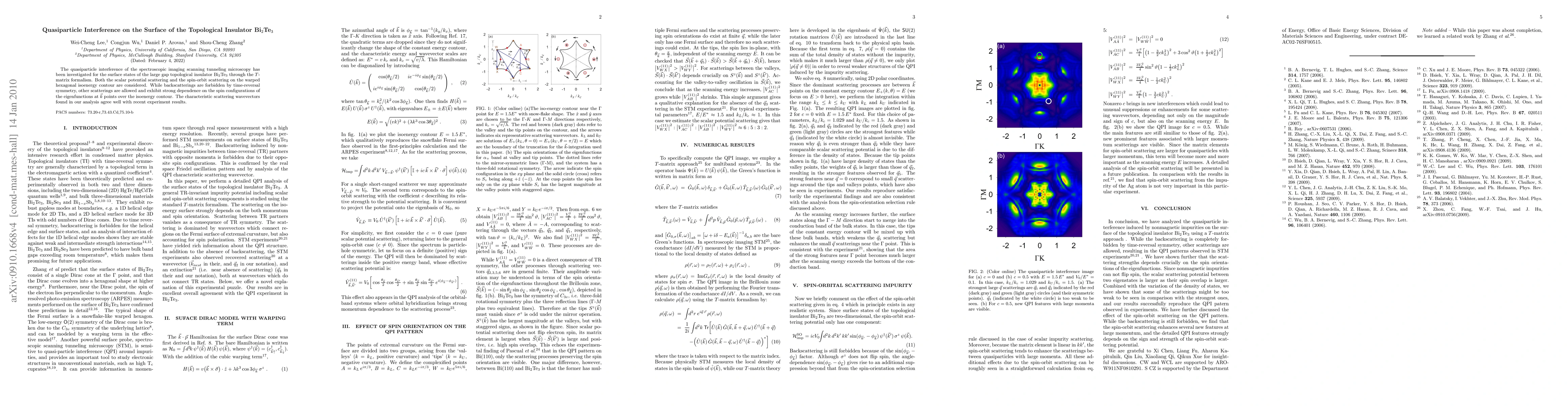 The quasiparticle interference of the spectroscopic imaging scanning tunneling microscopy has been investigated for the surface states of the large gap topological insulator Bi$_2$Te$_3$ through the T-matrix formalism. Both the scalar potential scattering and the spin-orbit scattering on the warped hexagonal isoenergy contour are considered. While backscatterings are forbidden by time-reversal symmetry, other scatterings are allowed and exhibit strong dependence on the spin configurations of the eigenfunctions at k points over the isoenergy contour. The characteristic scattering wavevectors found in our analysis agree well with recent experiment results.