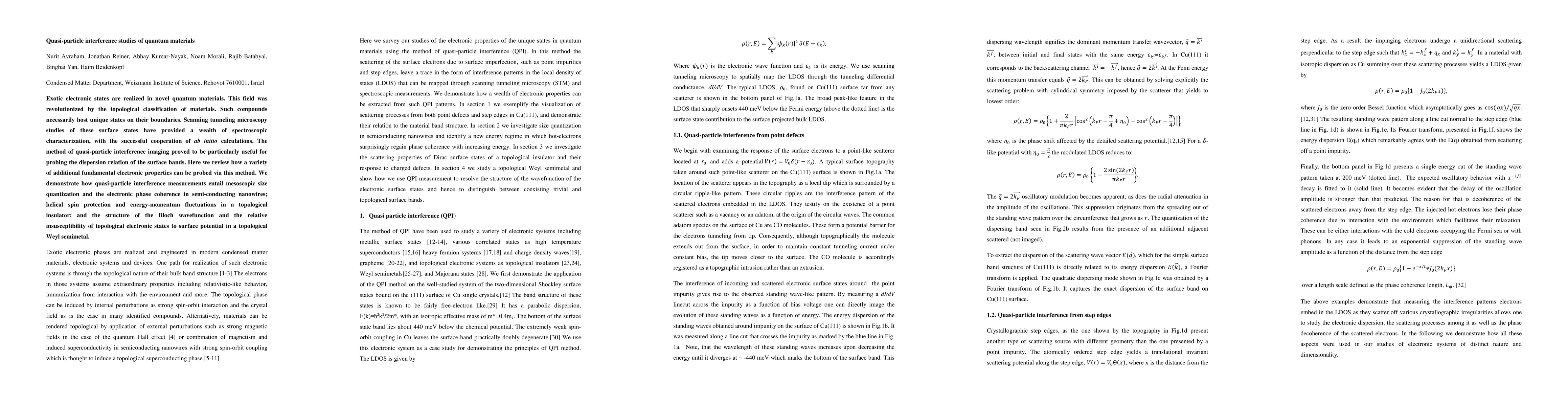 Exotic electronic states are realized in novel quantum materials. This field is revolutionized by the topological classification of materials. Such compounds necessarily host unique states on their boundaries. Scanning tunneling microscopy studies of these surface states have provided a wealth of spectroscopic characterization, with the successful cooperation of ab initio calculations. The method of quasiparticle interference imaging proves to be particularly useful for probing the dispersion relation of the surface bands. Herein, how a variety of additional fundamental electronic properties can be probed via this method is reviewed. It is demonstrated how quasiparticle interference measurements entail mesoscopic size quantization and the electronic phase coherence in semiconducting nanowires; helical spin protection and energy-momentum fluctuations in a topological insulator; and the structure of the Bloch wave function and the relative insusceptibility of topological electronic states to surface potential in a topological Weyl semimetal.