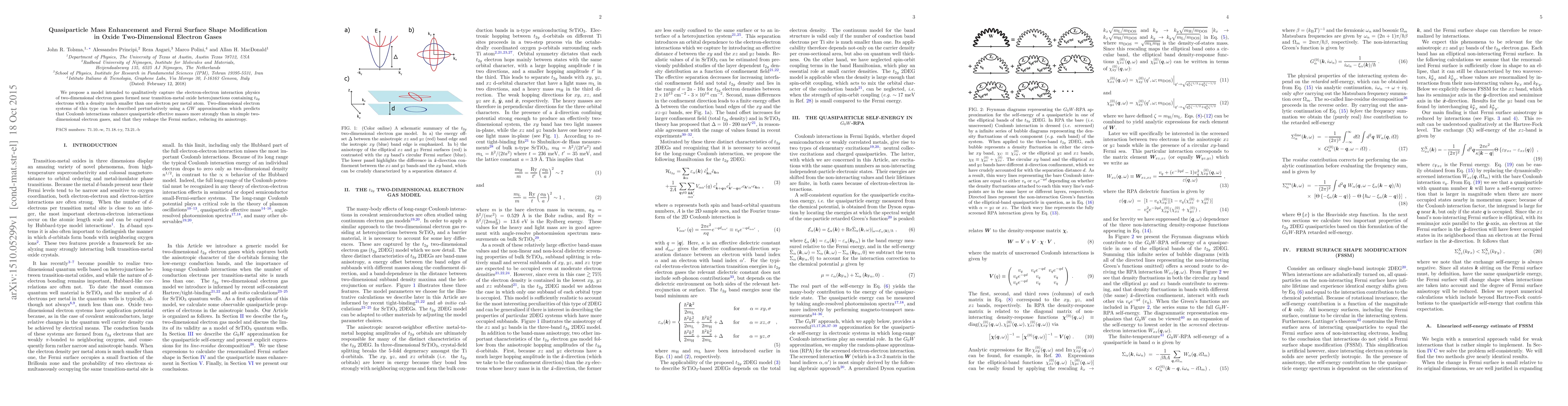 We propose a model intended to qualitatively capture the electron-electron interaction physics of two-dimensional electron gases formed near transition-metal oxide heterojunctions containing $t_{2g}$ electrons with a density much smaller than one electron per metal atom. Two-dimensional electron systems of this type can be described perturbatively using a $GW$ approximation which predicts that Coulomb interactions enhance quasiparticle effective masses more strongly than in simple two-dimensional electron gases, and that they reshape the Fermi surface, reducing its anisotropy.