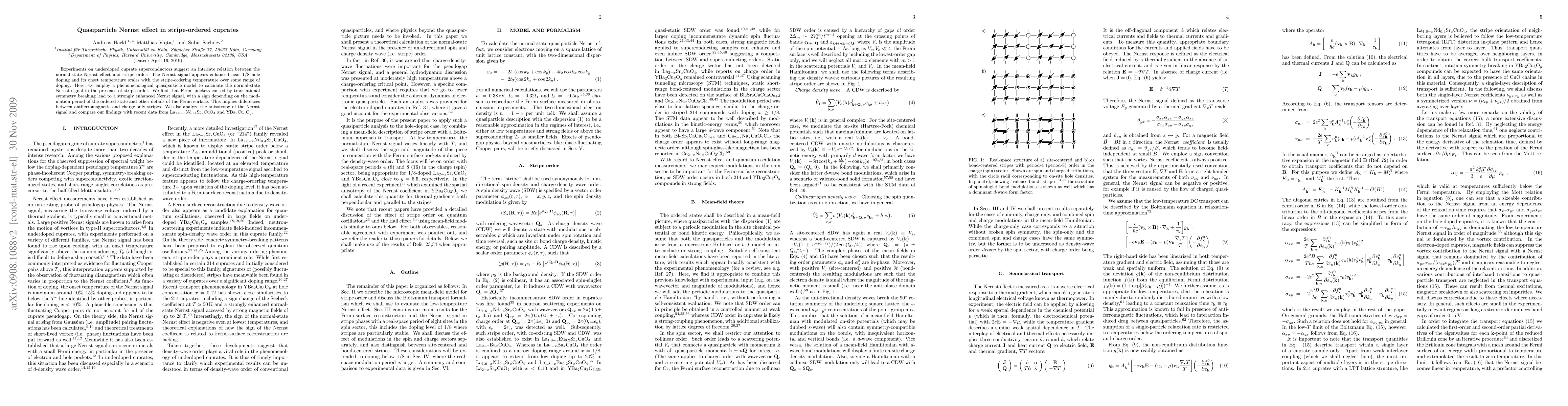 This paper investigates the quasiparticle Nernst effect in stripe-ordered cuprates, showing that Fermi pockets from symmetry breaking enhance the Nernst signal, which depends on the modulation period and Fermi surface details. The findings suggest differences between antiferromagnetic and charge-only stripes and are compared with experimental data from Nd-LSCO and YBCO.