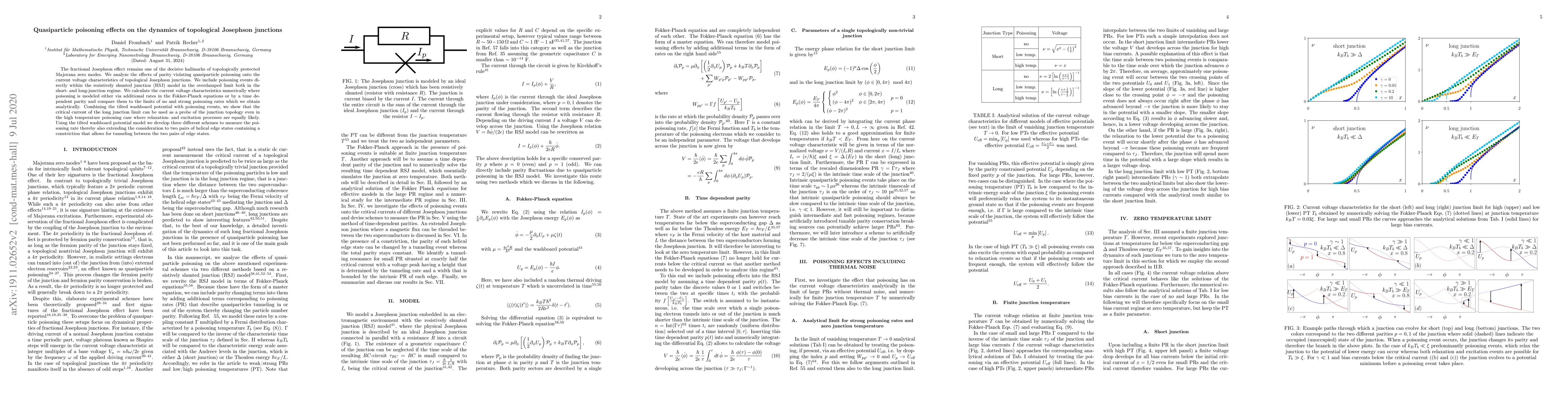 The fractional Josephson effect remains one of the decisive hallmarks of topologically protected Majorana zero modes. We analyze the effects of parity violating quasiparticle poisoning onto the current voltage characteristics of topological Josephson junctions. We include poisoning events directly within the resistively shunted junction (RSJ) model in the overdamped limit both in the short- and long-junction regime. We calculate the current voltage characteristics numerically where poisoning is modeled either via additional rates in the Fokker-Planck equations or by a time dependent parity and compare them to the limits of no and strong poisoning rates which we obtain analytically. Combining the tilted washboard potential with poisoning events, we show that the critical current of the long junction limit can be used as a probe of the junction topology even in the high temperature poisoning case where relaxation- and excitation processes are equally likely. Using the tilted washboard potential model we develop three different schemes to measure the poisoning rate thereby also extending the consideration to two pairs of helical edge states containing a constriction that allows for tunneling between the two pairs of edge states.