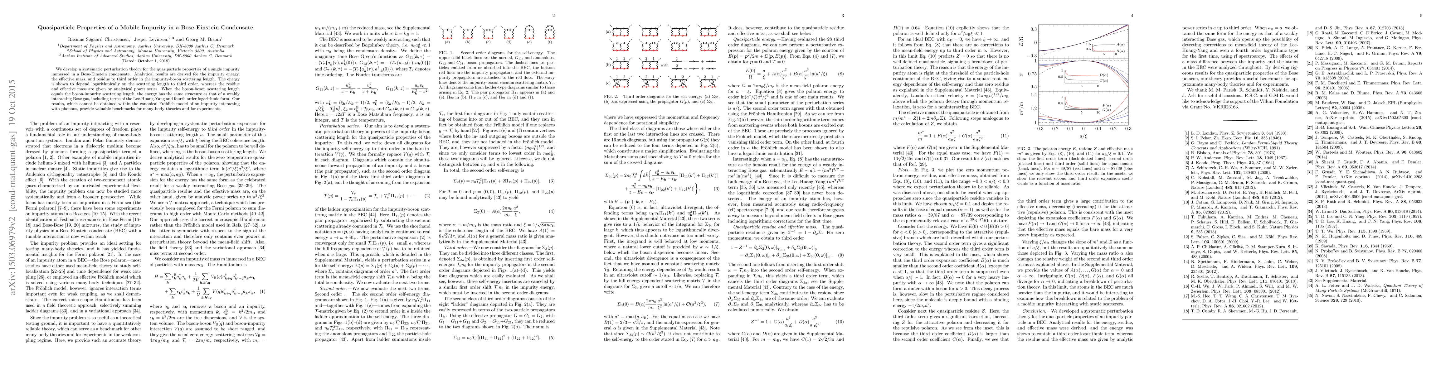 We develop a systematic perturbation theory for the quasiparticle properties of a single impurity immersed in a Bose-Einstein condensate. Analytical results are derived for the impurity energy, the effective mass, and residue to third order in the impurity-boson scattering length. The energy is shown to depend logarithmically on the scattering length to third order, whereas the residue and effective mass are given by analytical power series. When the boson-boson scattering length equals the boson-impurity scattering length, the energy has the same structure as that of a weakly interacting Bose gas, including terms of the Lee-Huang-Yang and fourth order logarithmic form. Our results, which cannot be obtained within the canonical Fr{\"o}hlich model of an impurity interacting with phonons, provide valuable benchmarks for many-body theories and for experiments.