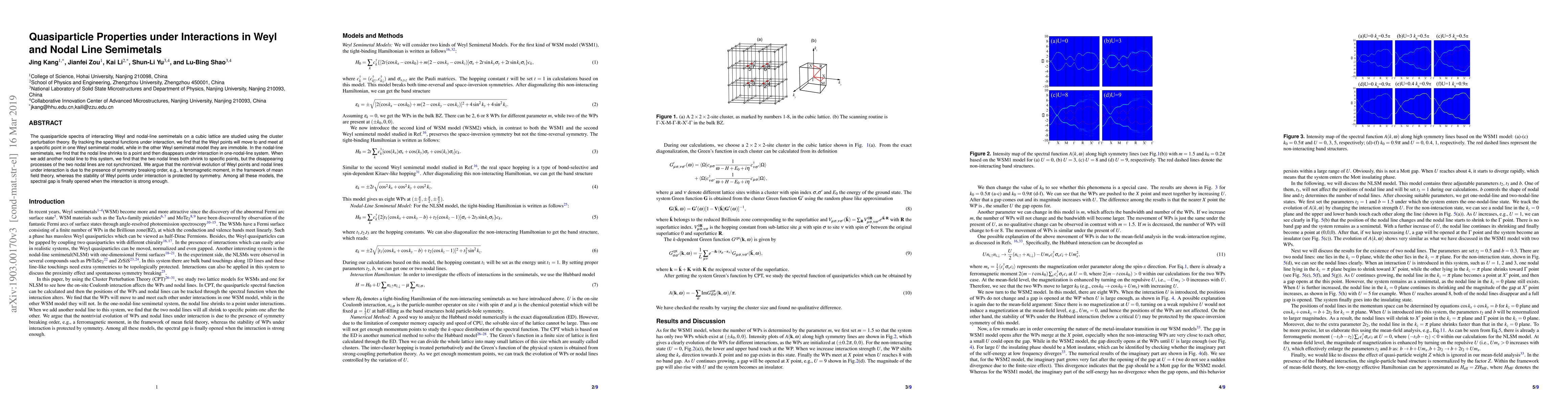 This study investigates how interactions affect quasiparticle spectra in Weyl and nodal-line semimetals using cluster perturbation theory. It finds that Weyl points in certain models can move and meet, while in others they remain fixed, and nodal lines can shrink and disappear under interaction, though not synchronously. The observed behavior is attributed to symmetry breaking order, and strong interactions eventually open a spectral gap.