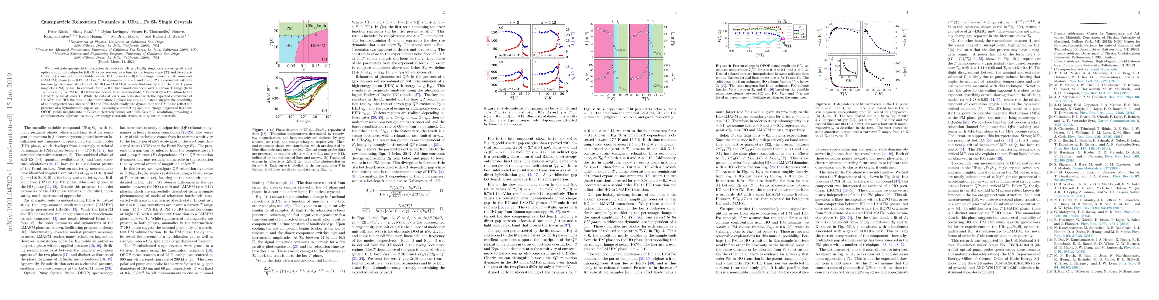 Researchers investigated quasiparticle relaxation dynamics in URu$_{2-x}$Fe$_{x}$Si$_{2}$ single crystals using ultrafast optical-pump optical-probe spectroscopy, revealing unexpected coexistence of phases at intermediate temperatures.