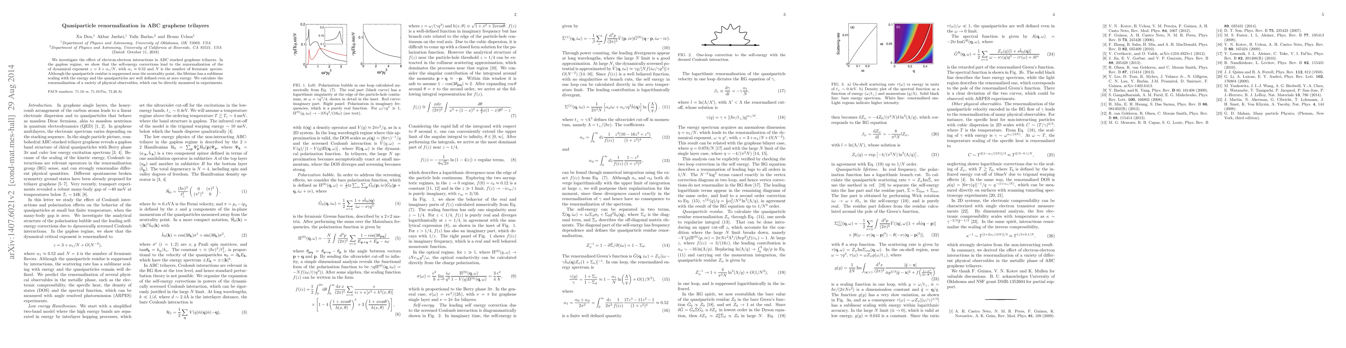 This paper examines electron-electron interactions in ABC stacked graphene trilayers, demonstrating that self-energy corrections lead to the renormalization of the dynamical exponent $z=3+\alpha_{1}/N$. Despite suppression of quasiparticle residue near neutrality, quasiparticles remain well-defined with sublinear energy scaling.