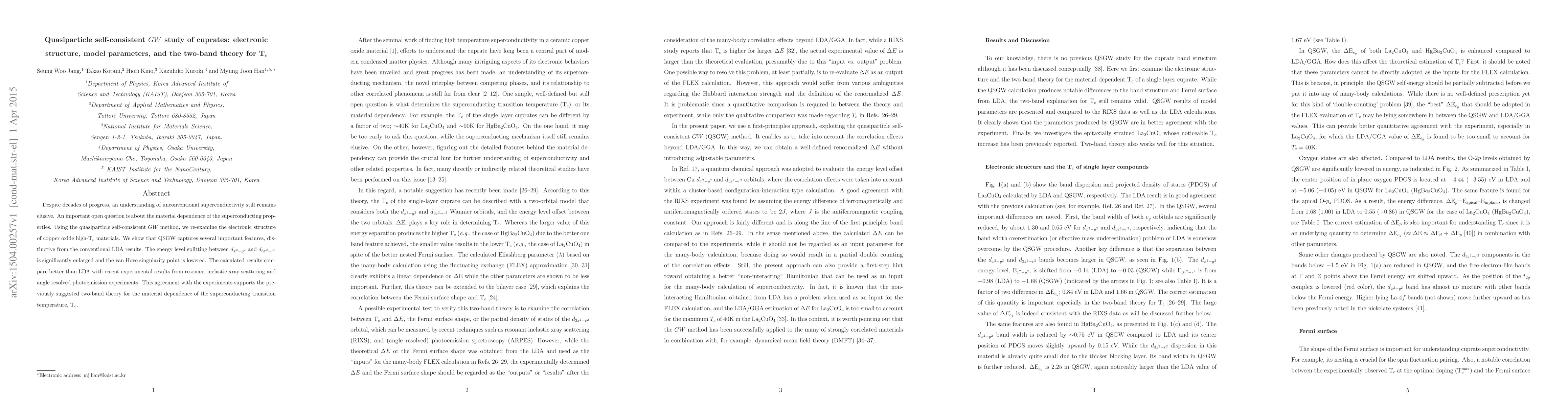 Despite decades of progress, an understanding of unconventional superconductivity still remains elusive. An important open question is about the material dependence of the superconducting properties. Using the quasiparticle self-consistent GW method, we re-examine the electronic structure of copper oxide high-Tc materials. We show that QSGW captures several important features, distinctive from the conventional LDA results. The energy level splitting between dx2-y2 and d3z2-r2 is significantly enlarged and the van Hove singularity point is lowered. The calculated results compare better than LDA with recent experimental results from resonant inelastic xray scattering and angle resolved photoemission experiments. This agreement with the experiments supports the previously suggested two-band theory for the material dependence of the superconducting transition temperature, Tc.